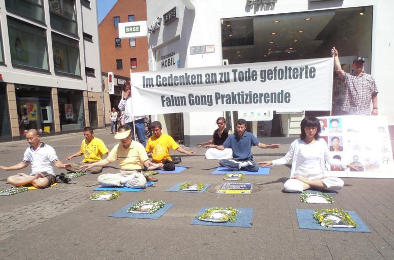 七月十九日,法轮功学员聚集在杜赛尔多夫市中心老城的海涅广场上,象过去十五年一样,他们向世人发放传单,讲清迫害真相和征集签名。为了进一步揭露迫害,尤其是中共活体摘取法轮功学员器官的罪行,他们还特别做了活摘器官的真人模拟演示,摆放了部分被迫害致死的法轮功学员的照片,悼念为坚持真理正义而失去生命的中国大陆法轮功学员。