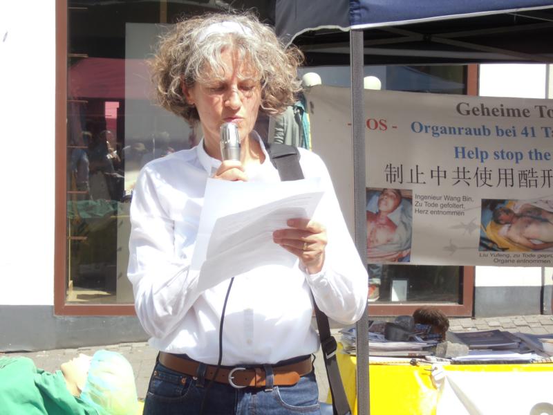 这次活动地点在杜赛尔多夫进入老城的主要街口通道上,从地铁出来的人和街面上要去老城的人汇合成密集不断的人潮。在集会上,这次活动的发言人碧尔格特女士向人们讲述法轮功真相,揭露中共江氏集团对真善忍的迫害,尤其是活摘器官的罪恶。她公布了几个最新的迫害数据:从一九九九年迫害开始到现在,得到证实的已有3769名法轮功学员被迫害致死;仅从二零一四年三月到五月就有1694名法轮功学员被非法抓捕;二零零一年到二零零五年,中国有四万一千例器官移植的供体来源得不到解释。她呼吁人们通过签名给予本次活动以道义的支持。