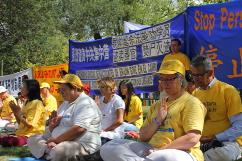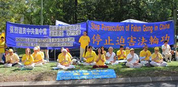 法轮功学员随着音乐集体炼功的场面吸引了很多过往的行人驻足观看。他们了解真相后都表示震惊。在使馆门前的信号灯前等待通行的车辆的司机都郑重地接过法轮功学员递给他们的真相资料,他们难以相信在中国大陆的法轮功学员只因修炼这优美的功法而被关押、被酷刑折磨甚至被迫害致死。