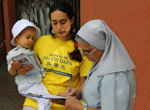 一对西班牙夫妇开车经过,看到法轮功学员和平抗议的场面后,特意将车停下来了解真相,当听说中共活摘法轮功学员器官时非常震惊和愤怒,他说:“这样的恶行简直比纳粹还要凶残!”他们在征签表上郑重签上自己的姓名,并表示要告诉所有他认识的亲朋好友都来声援法轮功。