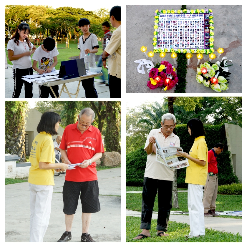 同一天傍晚,马来西亚南部柔佛州新山的法轮功学员为纪念在中国被迫害致死的学员,在新山的Setia Indah公园集体炼功和举办哀悼会,同时摆放真相展板。一些路过的民众都会放慢脚步细读。学员们希望中共对中国大陆学员十五年的残酷迫害立即停止。