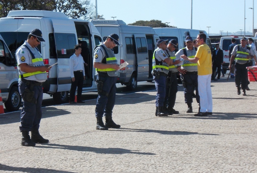 法轮功学员们在广场上坚守了两整天,这期间中共驻当地使馆的官员极度紧张,他们在学员拉横幅的路边停了一排中型面包车挡住法轮功学员(最少时四辆,最多时七辆),还不时停下双层大巴车,派遣官员来频繁挑衅辱骂法轮功学员。此外,他们还多次打电话招来各种类型的警车和警察,企图对学员进行骚扰,而法轮功学员们始终和平、理性地讲真相。一批批警察明白真相后撤走了,一车车随习*近*平来巴西的中国人也见证了法轮功学员们的坚定意志,其中有几个中共保安在学员讲真相劝说下退出了中共邪*党-。