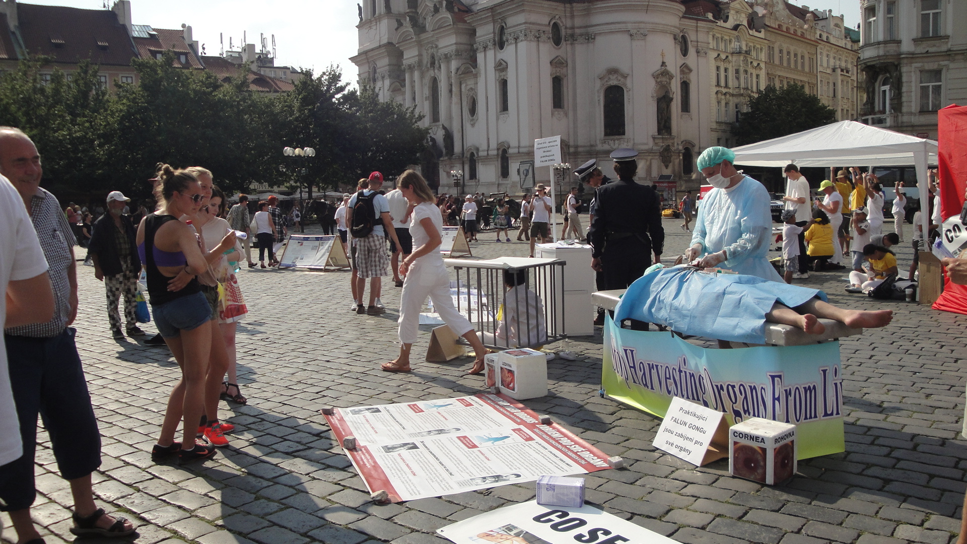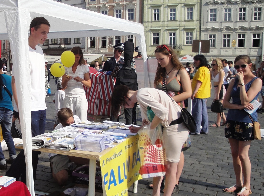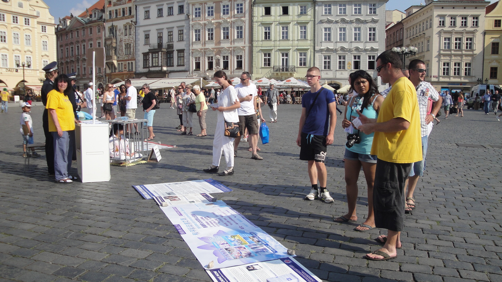布拉格老城广场曾在十一至十二世纪中,是欧洲贸易非常重要的集市之一,也是决定捷克历史命运的政治事件发生地,所以吸引了各国游客前来观光。在活动中,学员们以集体炼功、展示真相展板和真人酷刑演示、播放真相录音、派发真相传单等方式向过往行人和游客介绍法轮大法的美好,以及揭露中共血腥迫害法轮功的滔天罪恶。许多游人驻足观看,并了解真相,其中也包括来自中国大陆的民众。