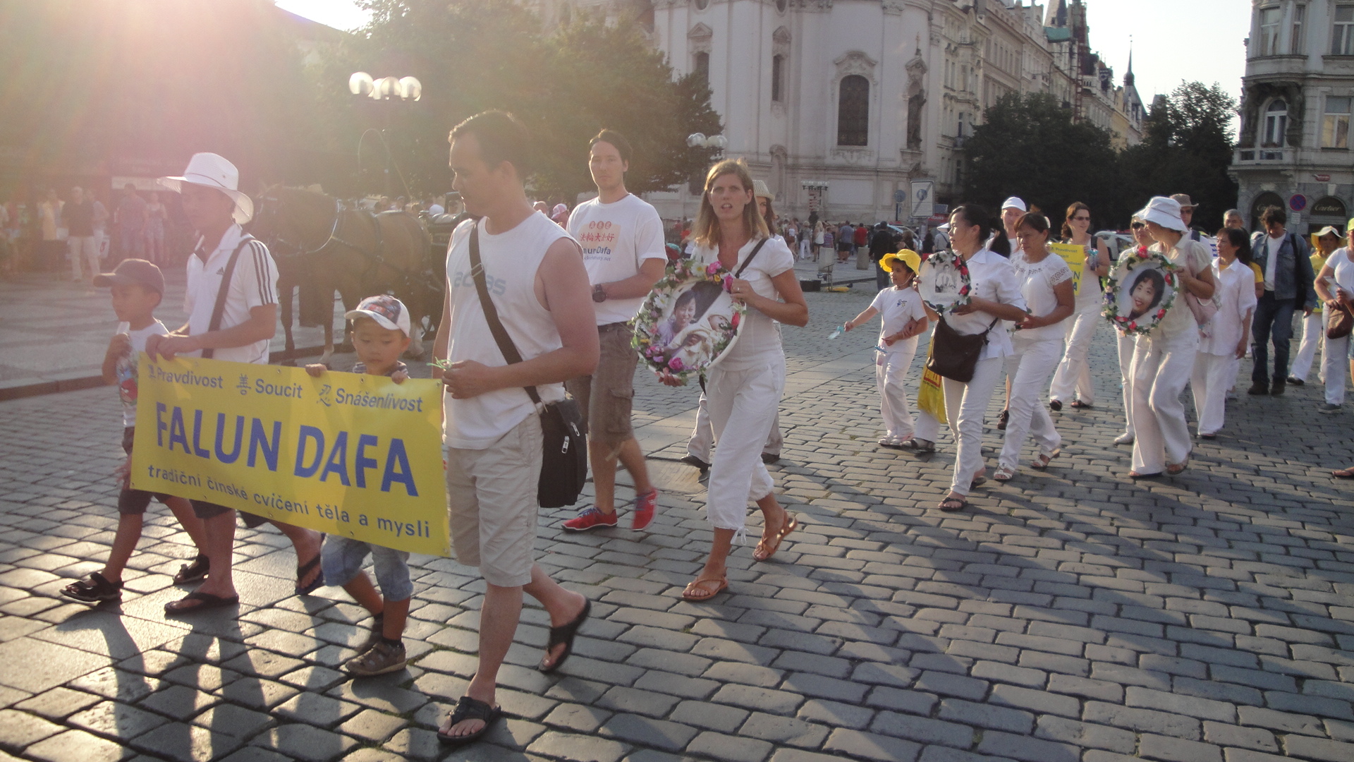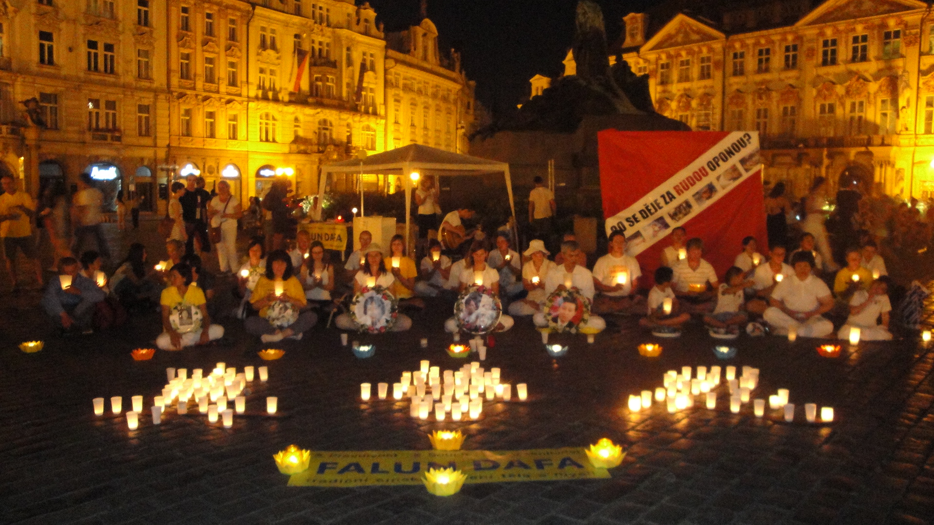 ![]() 夜色降临后,法轮功学员在布拉格老城广场举行烛光夜悼,悼念被中共迫害致死的法轮功学员。 |