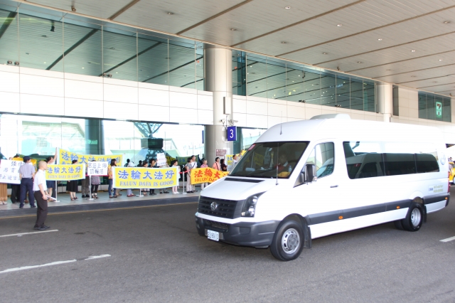 ![]() 二十一日,当中共江西省委书记强卫(白色坐车)一到桃园机场接机大厅,便被法轮功学员当面告知:“你被告了!停止迫害法轮功。” |