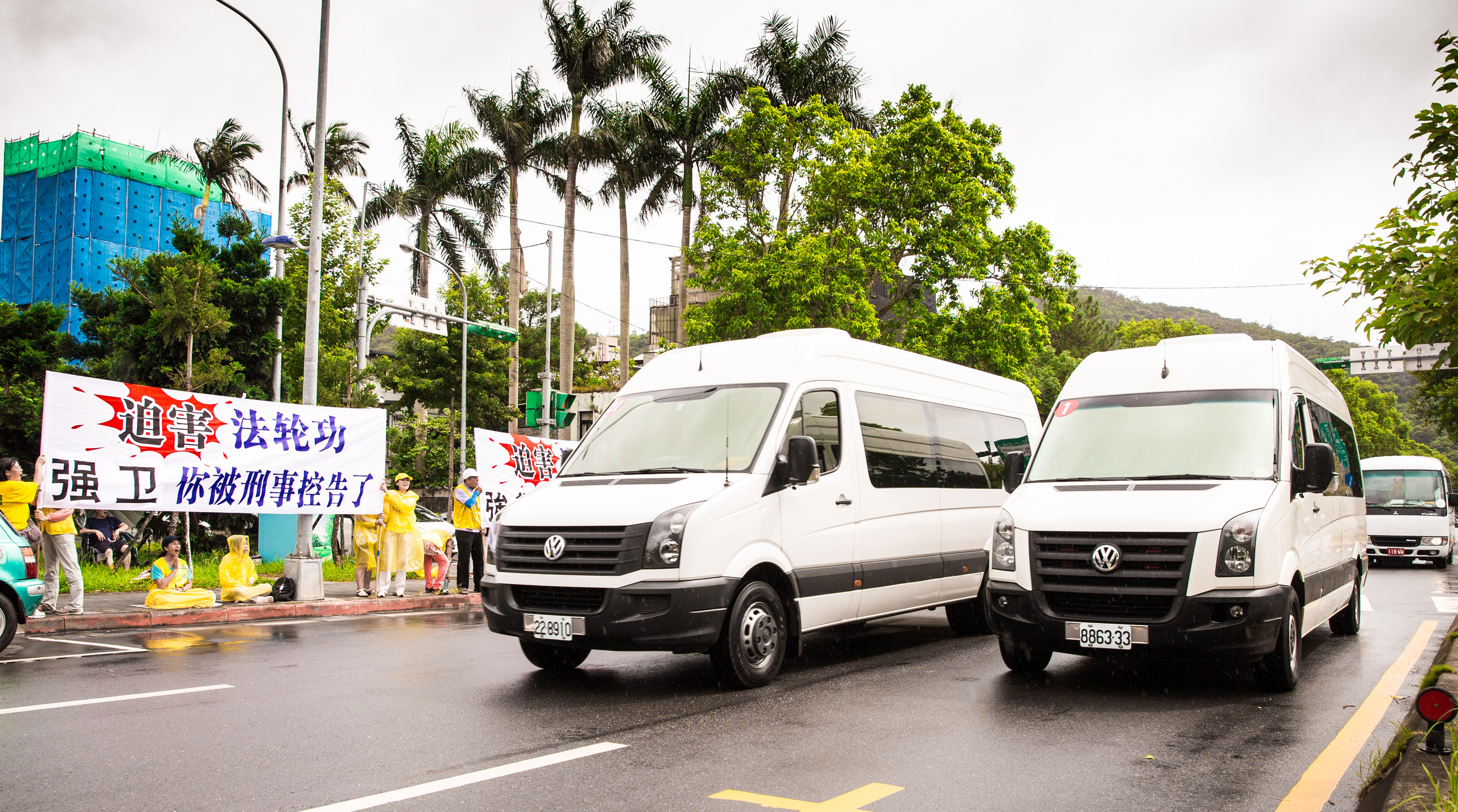 这几天巧遇台风袭台,强卫车队所到之处都有法轮功学员顶着强风暴雨,以醒目的标语和强大声浪告诉强卫:“恶贯满盈” 、“你被告了”。台湾多位立委、议员以及专家学者也跨党派站出来支持追究人权恶棍责任。