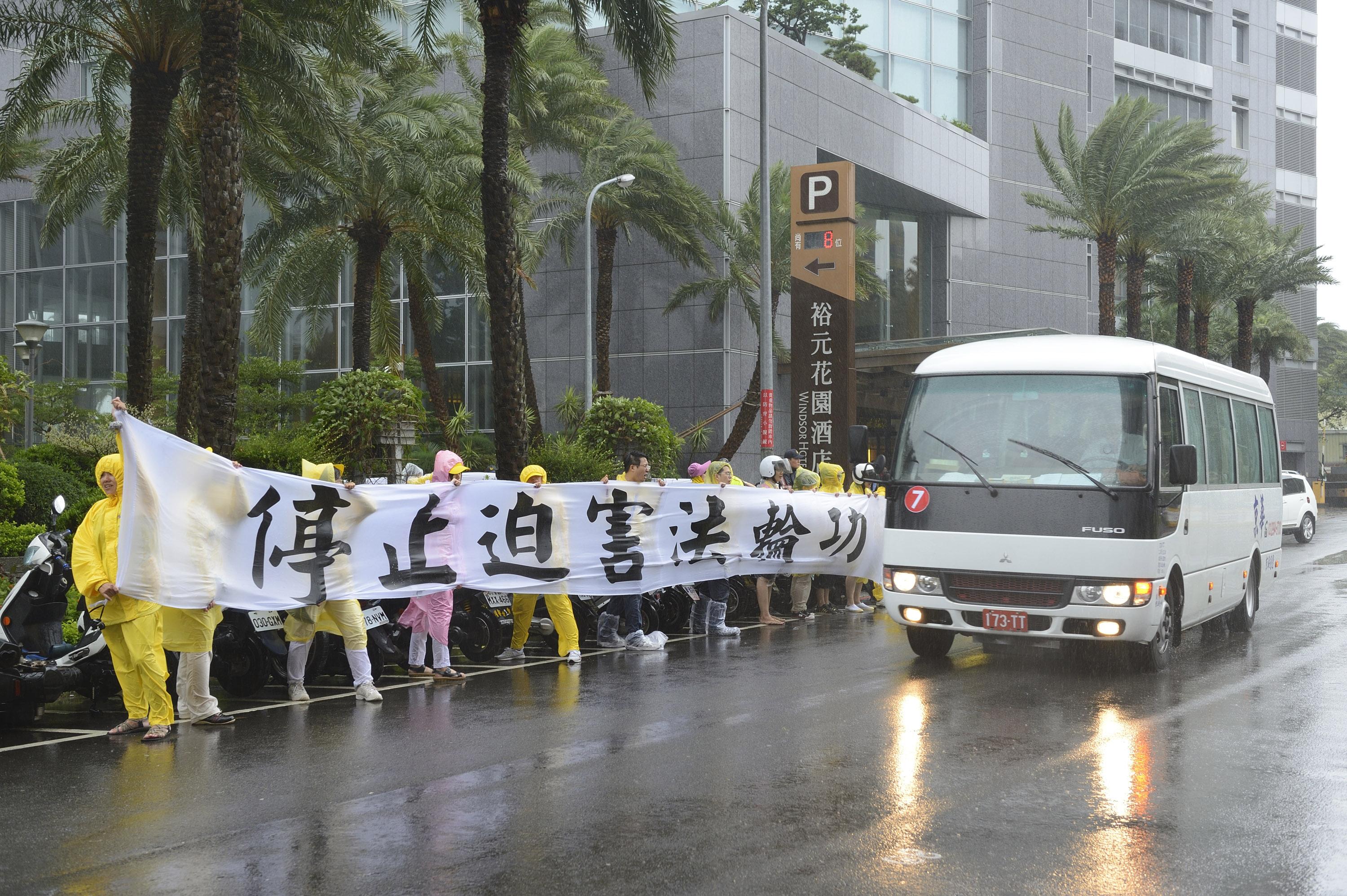 ![]() 二十三日台风袭台,强卫车队至台中市裕元花园酒店,法轮功学员顶着强风暴雨拉着横幅告诉强卫:“停止迫害法轮功。” |