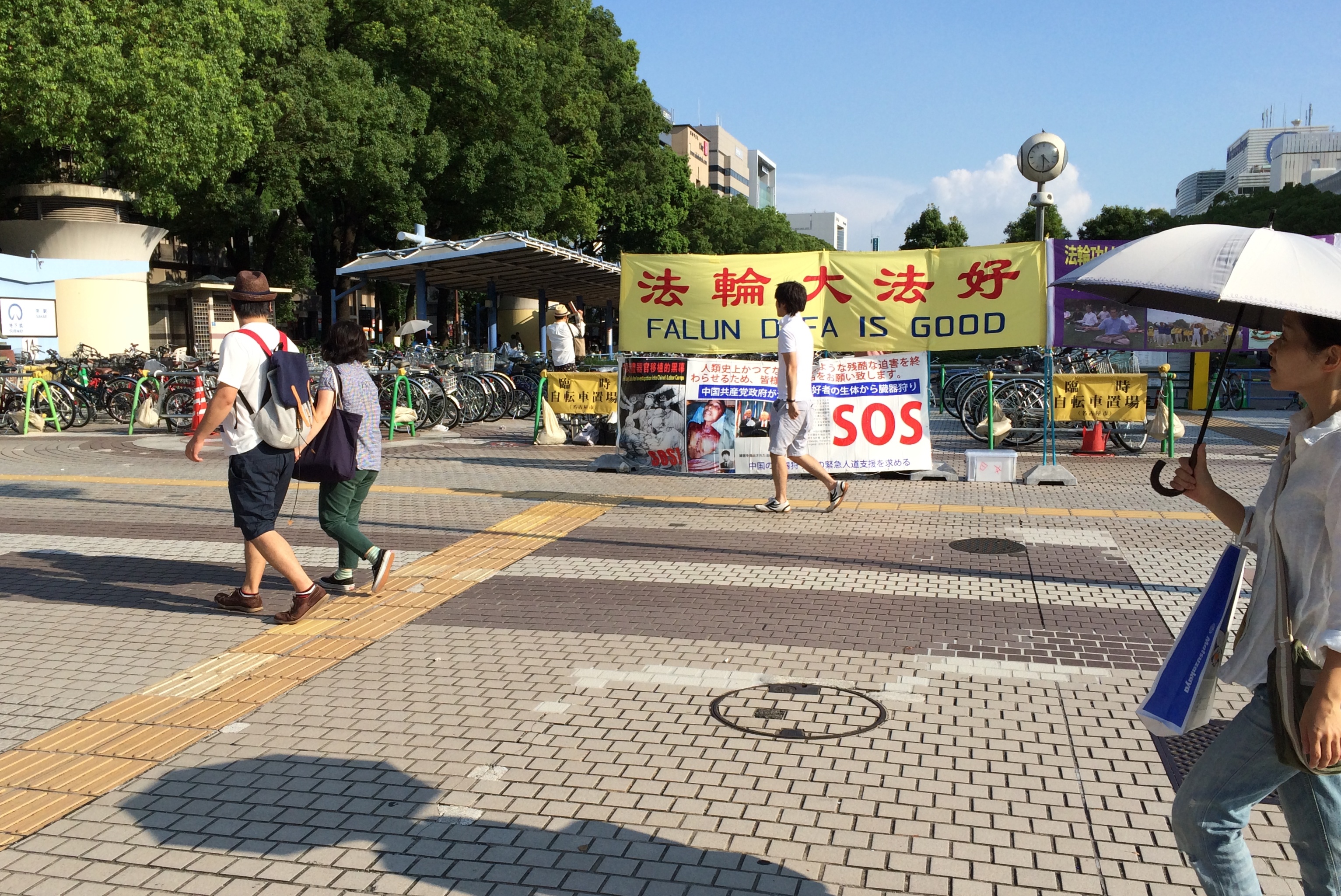 ![]() 在爱知县名古屋市的荣(Sakae)设立的真相点,法轮功学员们打出了写有“法轮大法好”、“法轮功已弘传世界100多个国家与地区”的真相横幅。 |