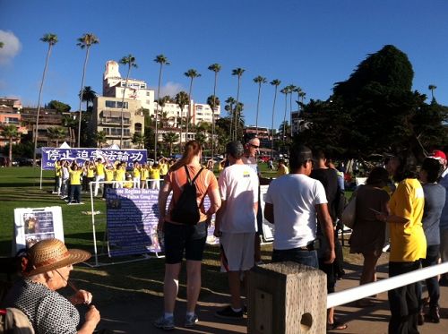 【明慧网二零一四年七月二十六日】十五年前的七月二十日,中共江氏集团在全中国范围内发动了对法轮大法的残酷迫害,从此引发全世界各国法轮功学员的和平反迫害,至今从未间断过。今年的这一天,二零一四年七月二十日,南加州圣地亚哥法轮功学员在当地著名的拉荷亚海湾风景点集体炼功,向游人讲真相,纪念法轮功学员和平反迫害十五周年,呼吁制止中共迫害。
