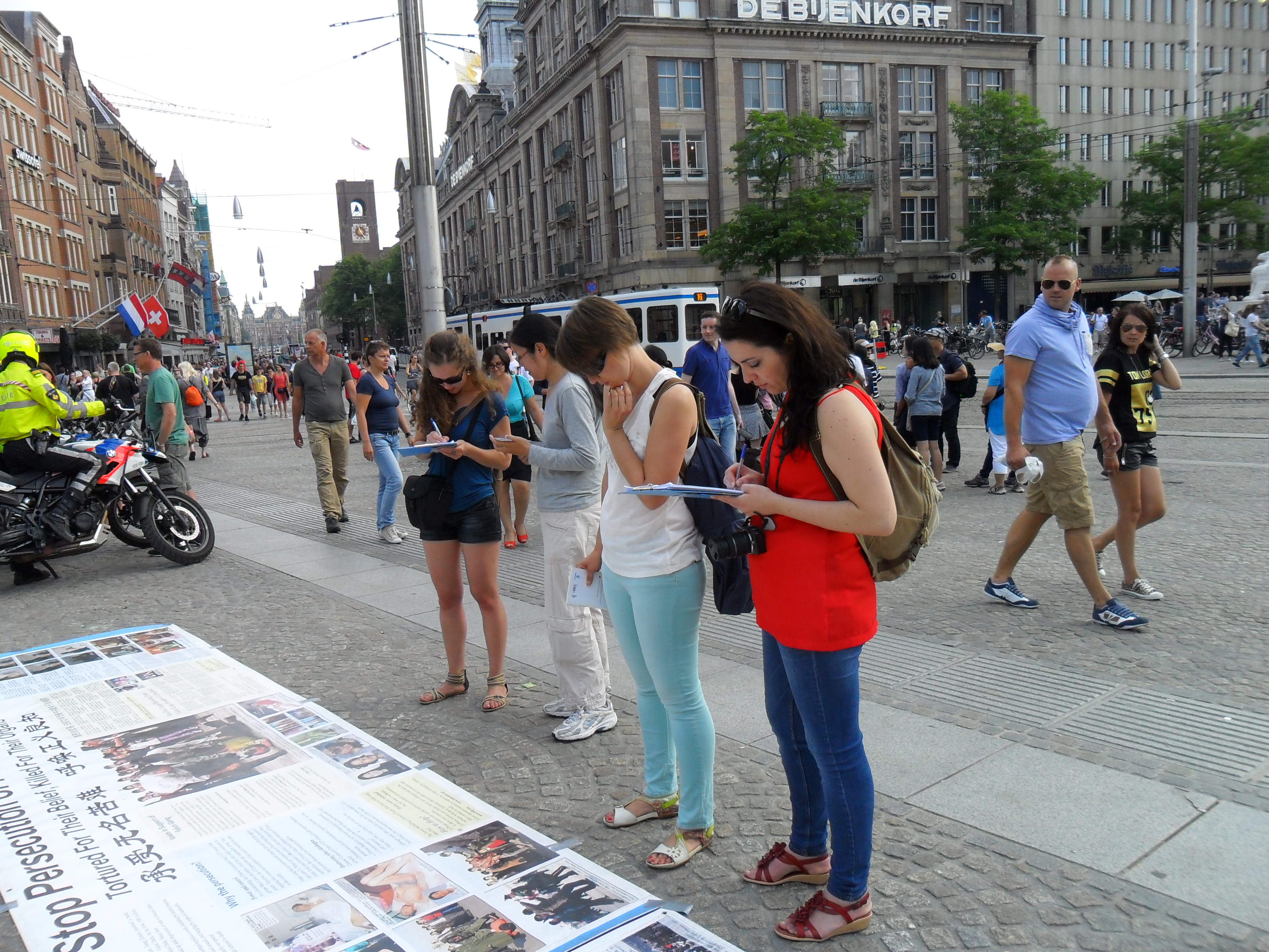 ![]() 纪念和平反迫害十五周年,荷兰学员在阿姆斯特丹著名的达姆广场设立真相点,大批游人驻足阅读真相图片,了解真相。 |