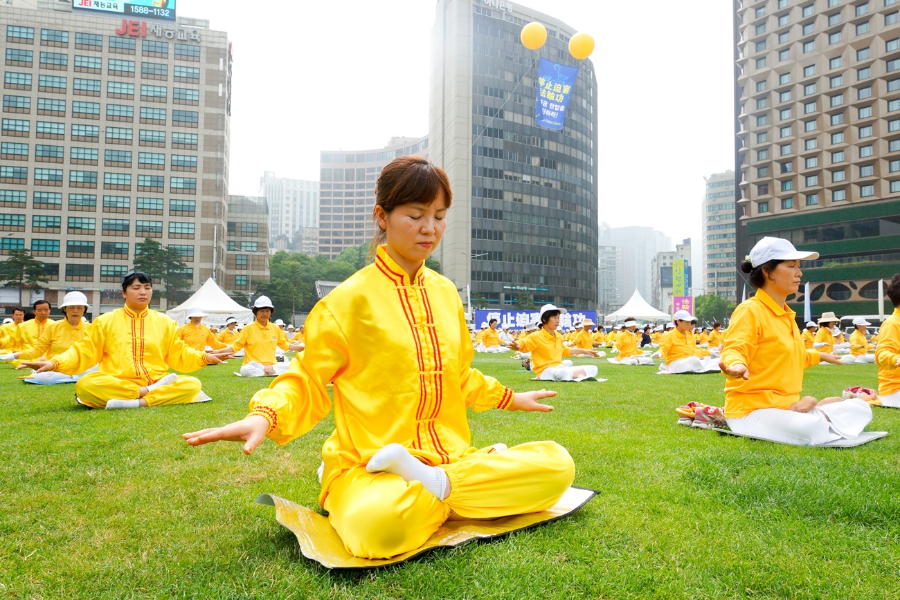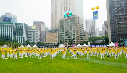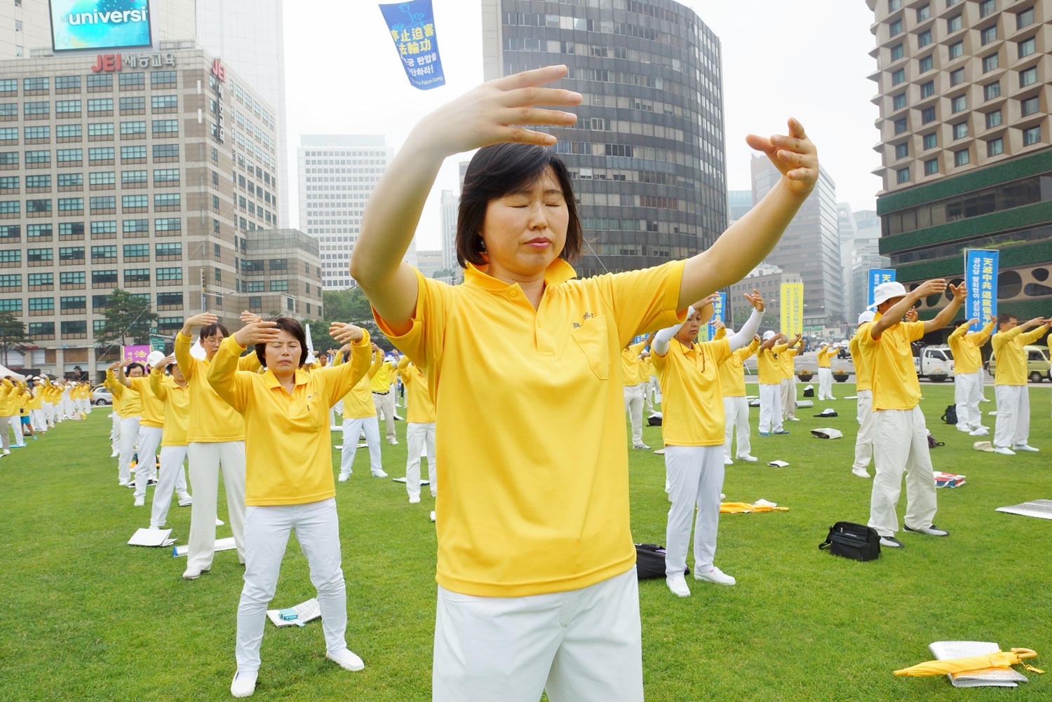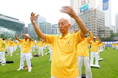 ![]() 图1-5 : 纪念法轮功学员和平反迫害十五周年,韩国法轮功学员在首尔广场集体炼功,呼吁法办迫害元凶。 |