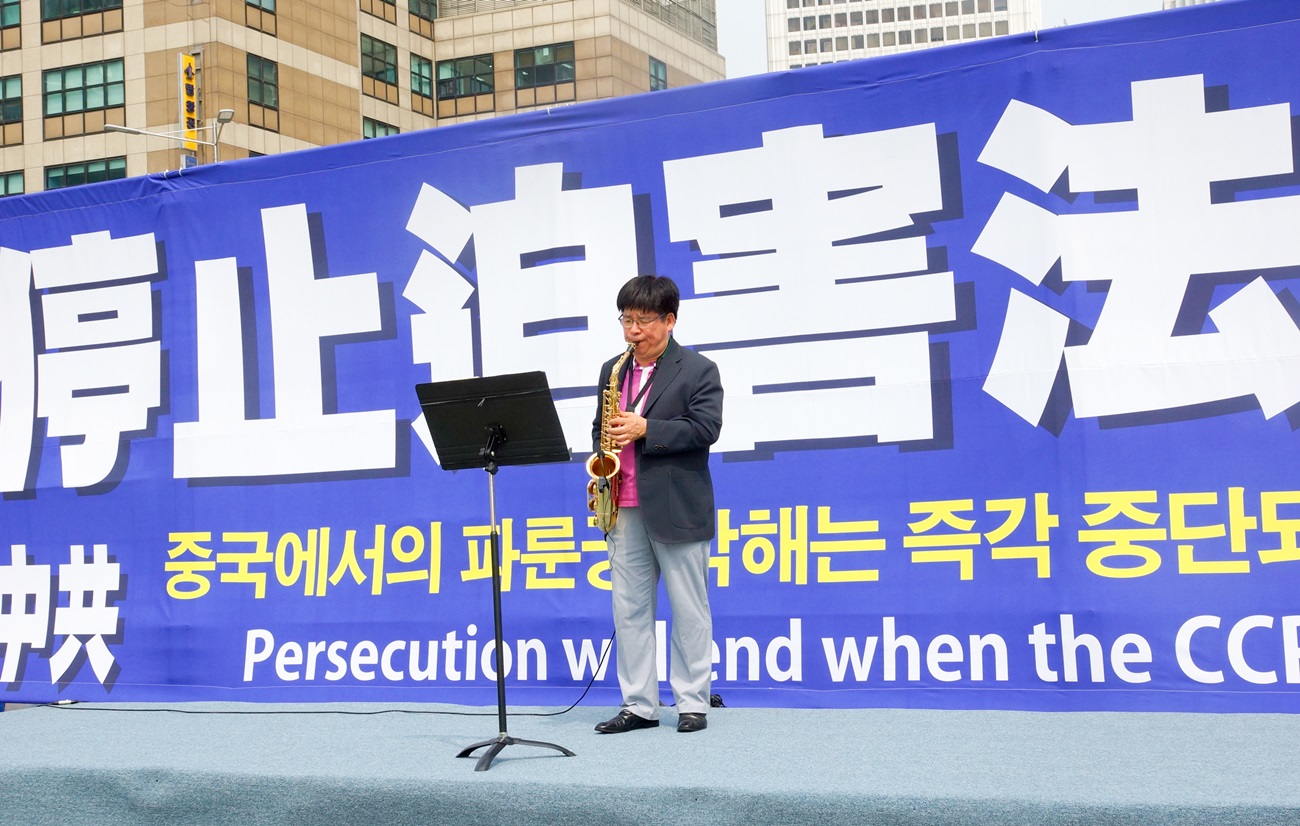 ![]() 图7: 法轮功学员演奏萨克斯曲目,悼念为坚持真善忍的信仰而被中共迫害致死的法轮功学员。 |