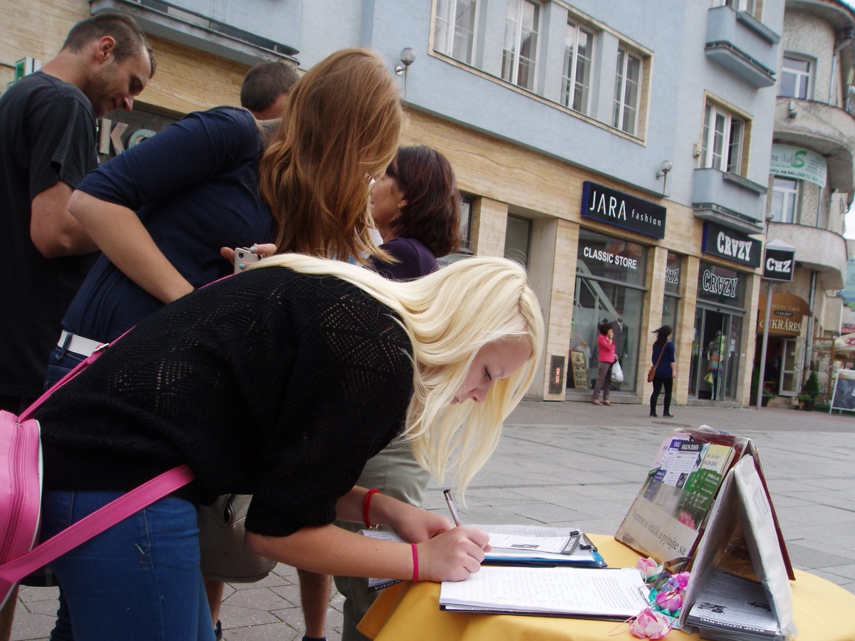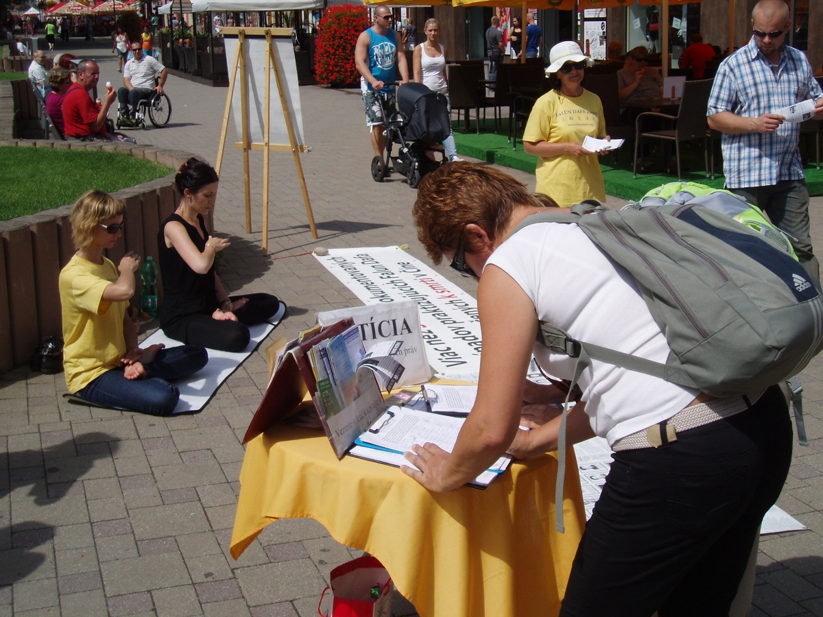 在斯洛伐克第二大城市科希策(Kosice),很多人见到法轮功学员们就说:“我们记得你,我们已经看到你在坐在公园里炼功。”有的说“我们已经签过反迫害请愿书了。”那天在真相展位前,经常出现人们排队要求签名的场景。