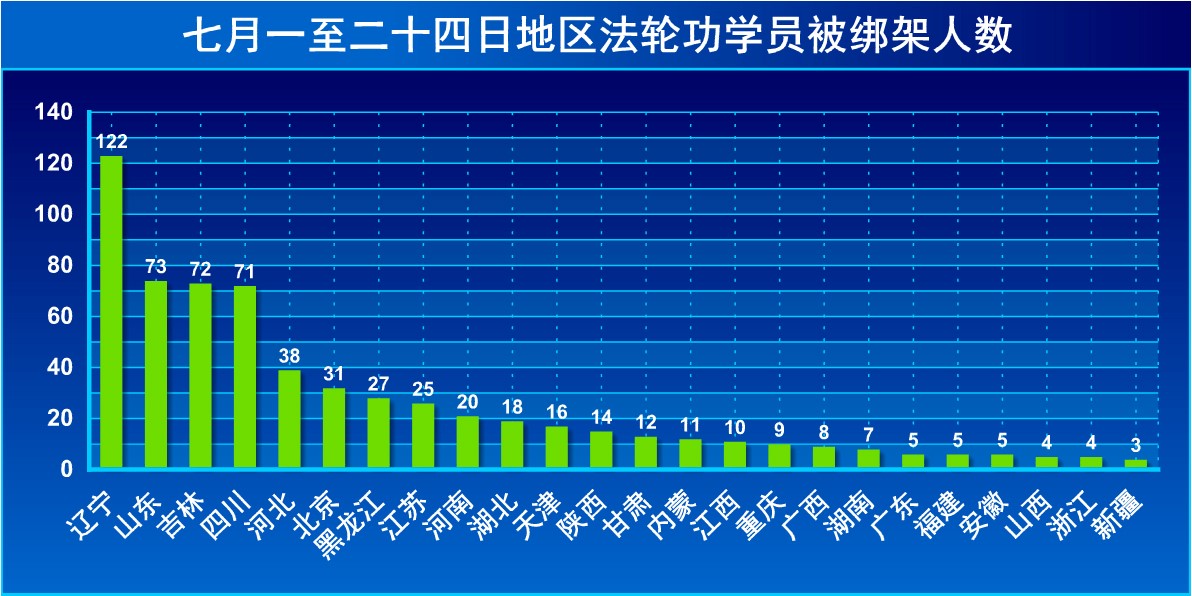 据截止到七月二十七日的明慧网资讯统计,从七月一日到二十四日,大陆共有六百一十四名法轮功学员被绑架,如下图所示。辽宁、山东、吉林、四川绑架法轮功学员的情况最为严重。多数法轮功学员被绑架到洗脑班而短期非法关押。