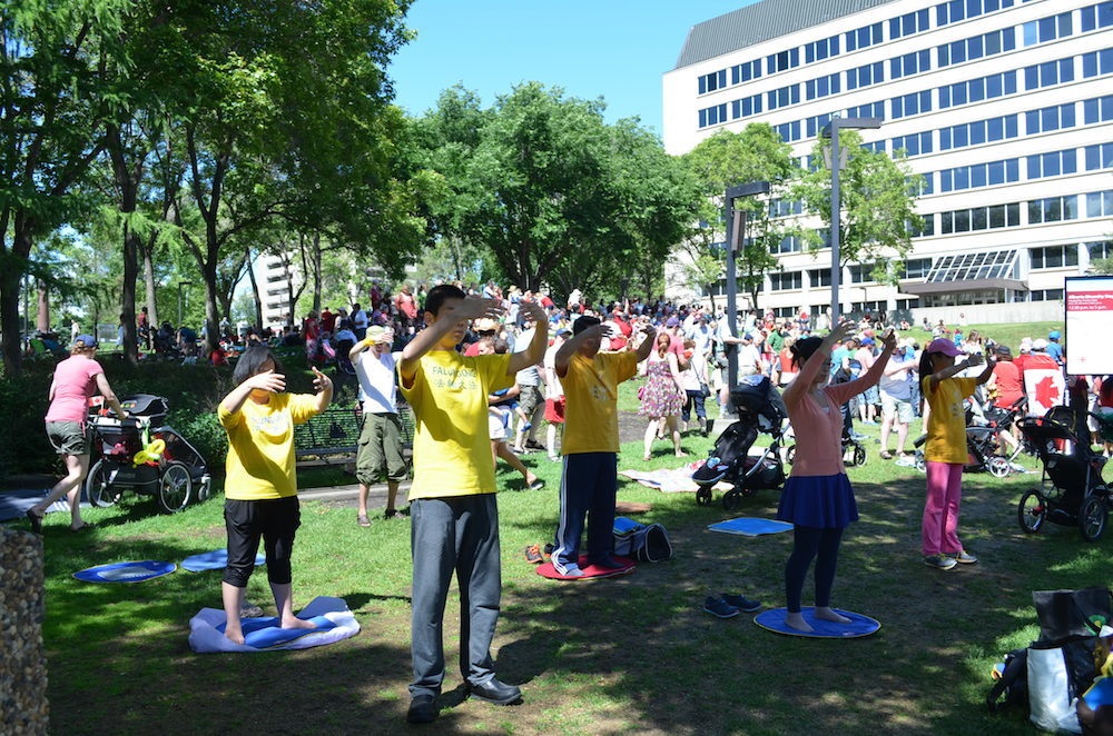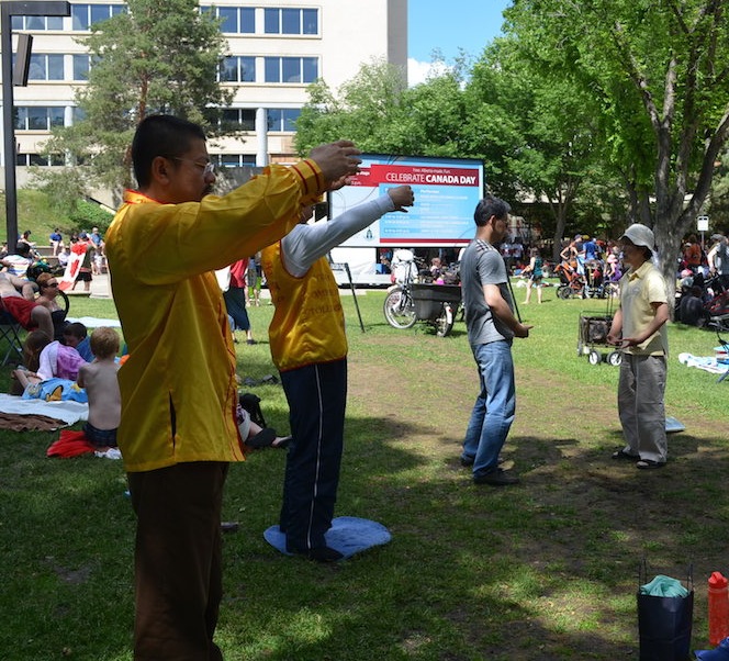 每年埃德蒙顿法轮功学员在国庆节到省议会大厦前炼功、讲真相已经成为惯例,二零一四年也不例外,在一片喧嚣中,一群身着黄色炼功服的人在绿色的草地上打坐炼功,如此的宁静、如此的专注,仿佛完全不受周围一切的影响。人们被这份祥和深深的吸引,驻足观看、了解真相。到傍晚时分,学员们带去的所有资料几乎都发完了。