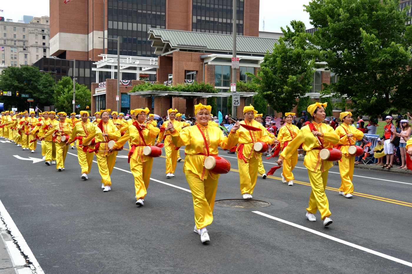 由五十多名法轮功学员组成的腰鼓队在浩浩荡荡的游行队伍中特别引人注目。他们身着亮黄色服装,敲着欢快的腰鼓,踏着整齐轻快的步伐,所到之处赢得了路旁观众的热烈掌声,许多人挤出人群拍照,高声欢呼。