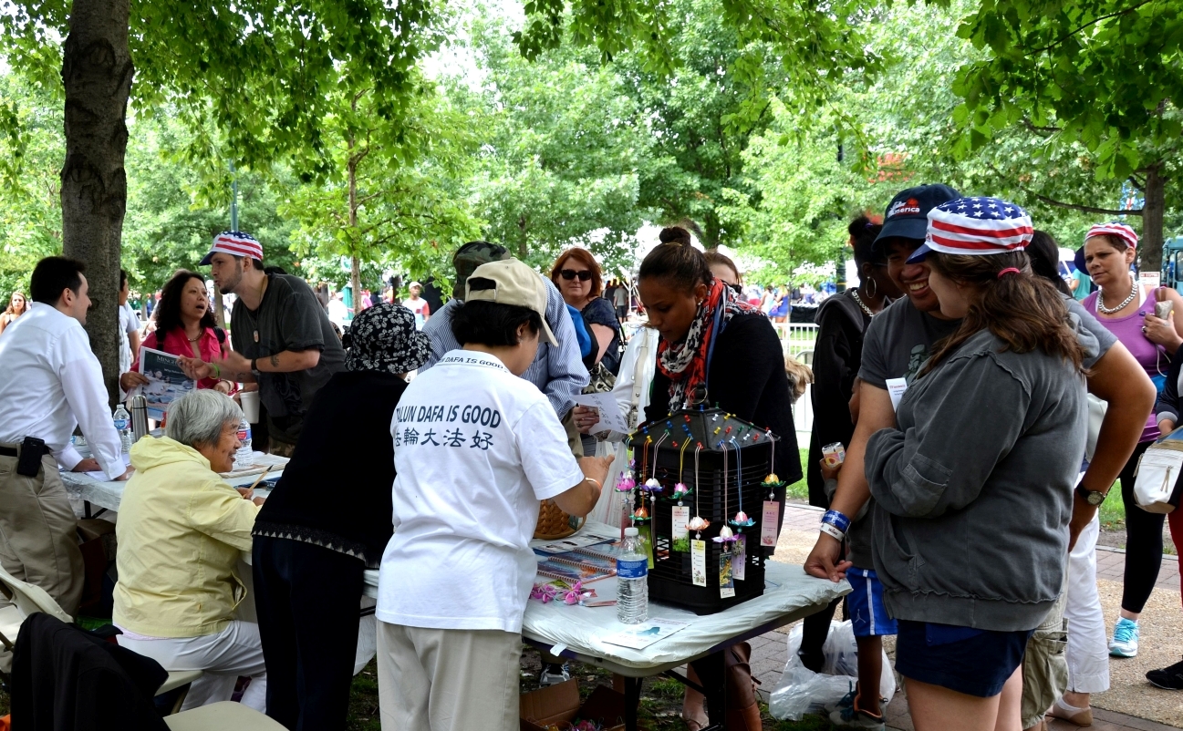 游行结束后,在本杰明·富兰克林大道上,美国独立日最大的免费精彩音乐会和趣味盎然的各种娱乐活动又开始了。大费城明慧学校大法弟子表演了莲花舞等中国传统舞蹈,法轮功学员讲解并演示了法轮功功法,赢得了观众的热烈喝彩。在法轮功的展位上有中国书法展示,折纸莲花、以及各种介绍法轮功的资料和真相材料。法轮功功法表演及教功也吸引了众多游人驻足观看,并积极了解真相。