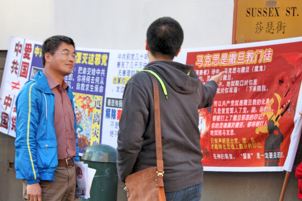 “三:退.”(退出中共党、团、队)义工小玉说,今天她对不明真相的路人讲“三:退.”和发真相报纸都很容易,人们都会赞同,有的还帮助讲真相。比如,有一个路人走过义工身边,看到义工在劝退就很不满,并开始大吵大嚷,这时旁边另一位华人就对着吵嚷的华人讲真相,最后还说:“我如果不是反对共产党的话,我都不会出来外国了。”越来越多的华人觉醒,还帮助讲真相,劝“三:退.”。