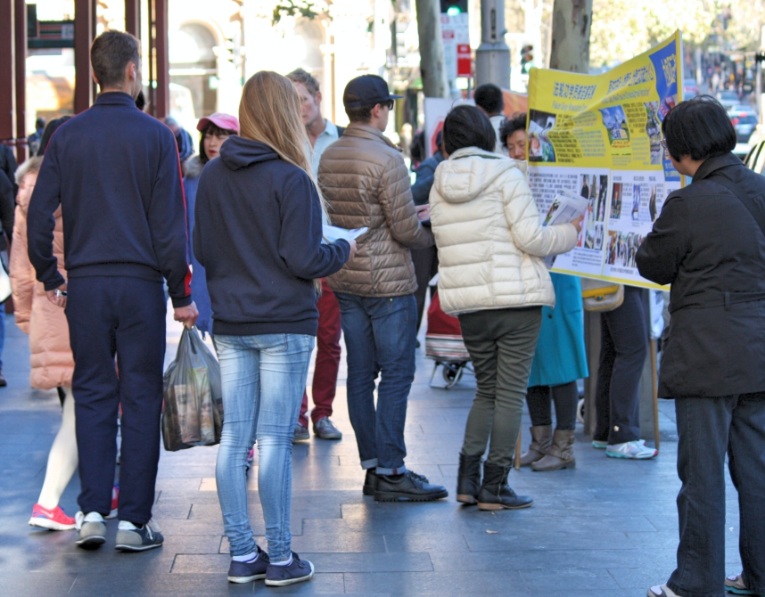 George和另外三位男青年走过真相摊位,他们了解了真相后,有两位轻轻拍拍法轮功学员的肩膀,说:要坚强一点,你们做得很好,要坚持做下去。最后四个年轻人都在制止活摘法轮功学员器官的征签表上签了名。