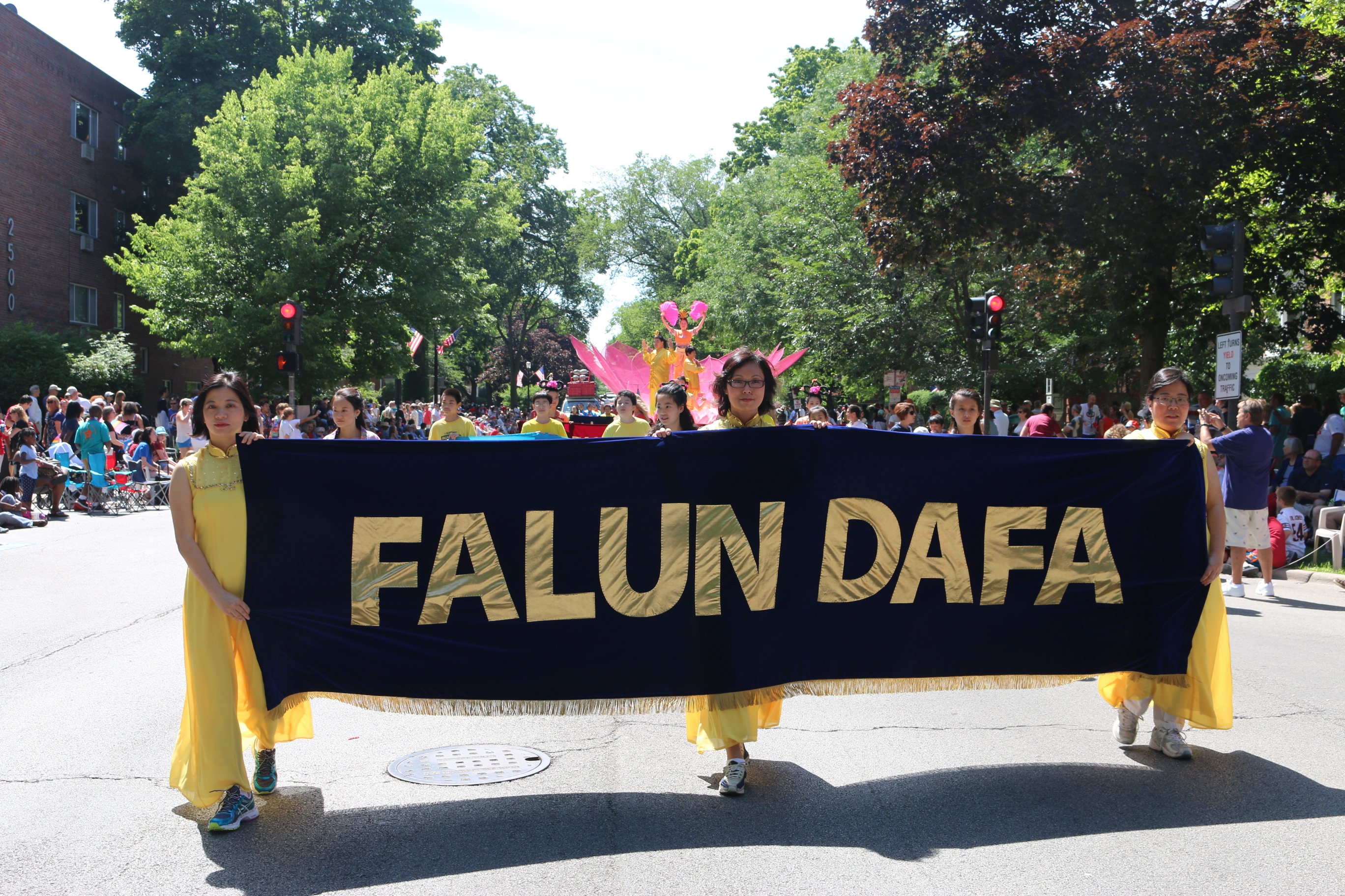 ![]() 图1:芝加哥法轮功学员连续第十四年参加埃文斯顿市独立日游行。 |