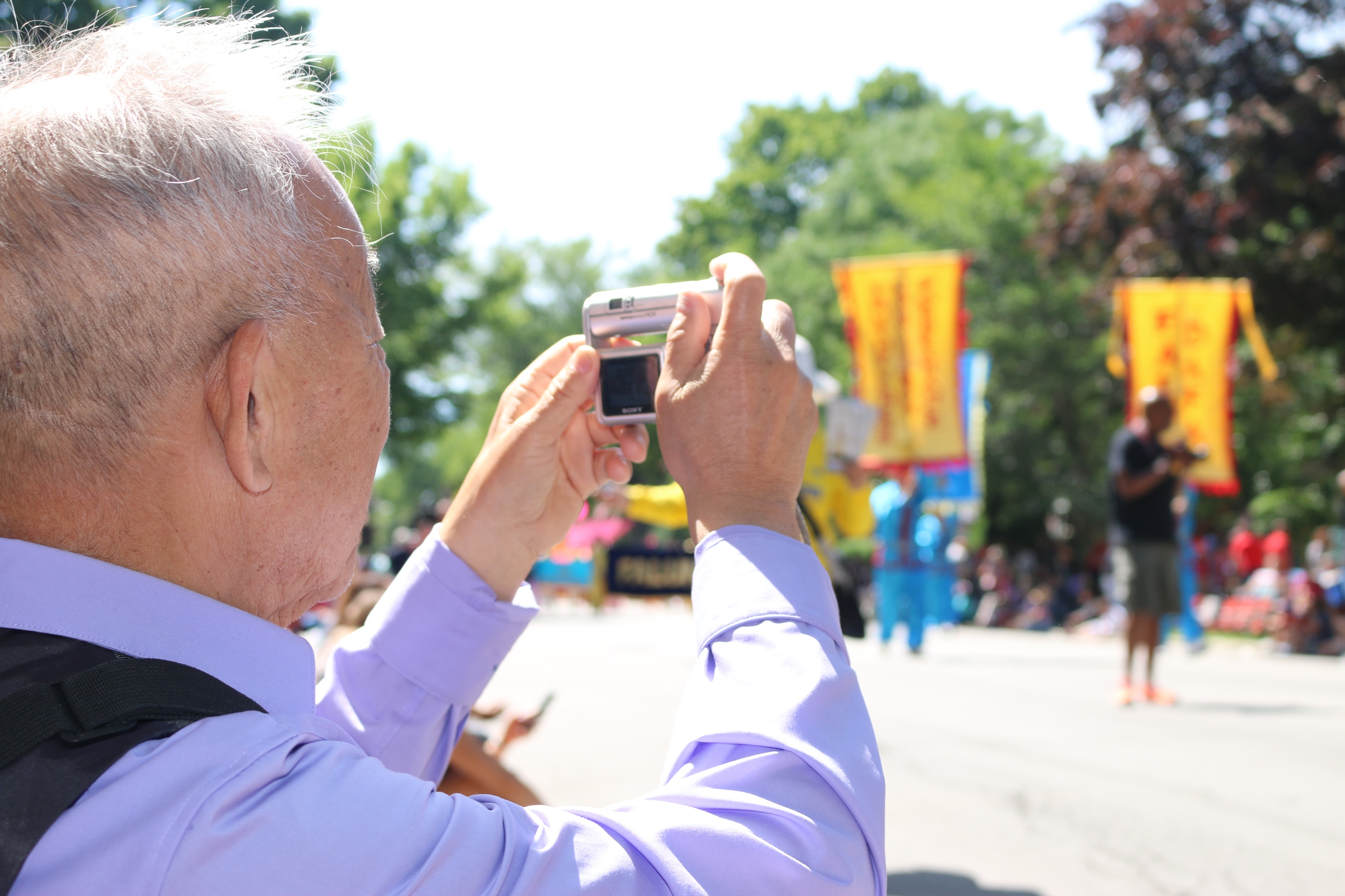 ![]() 图3:来自大陆河南的赵先生拿出相机拍下法轮功游行队伍。 |