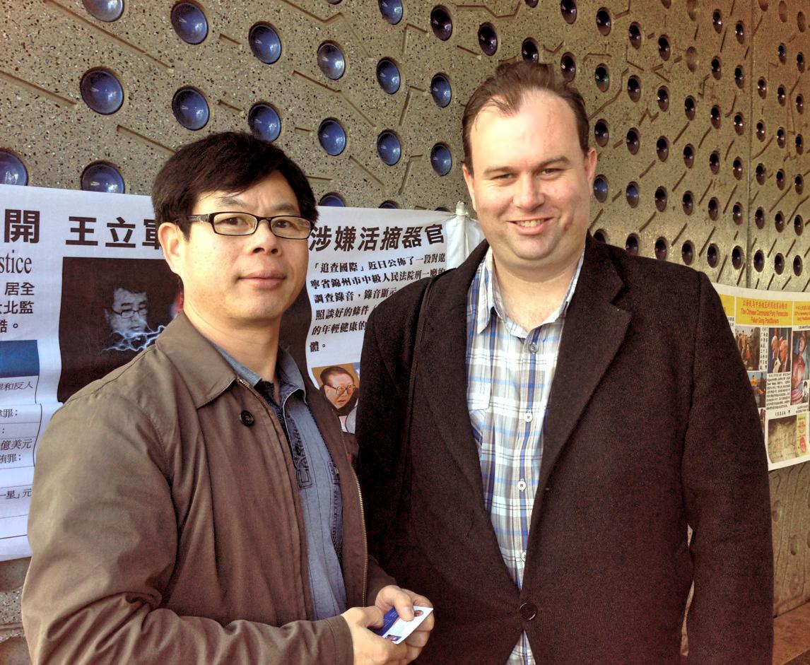 ![]() 帕拉玛塔市议员詹姆斯•肖(James Shaw,右)向法轮功学员了解真相 |