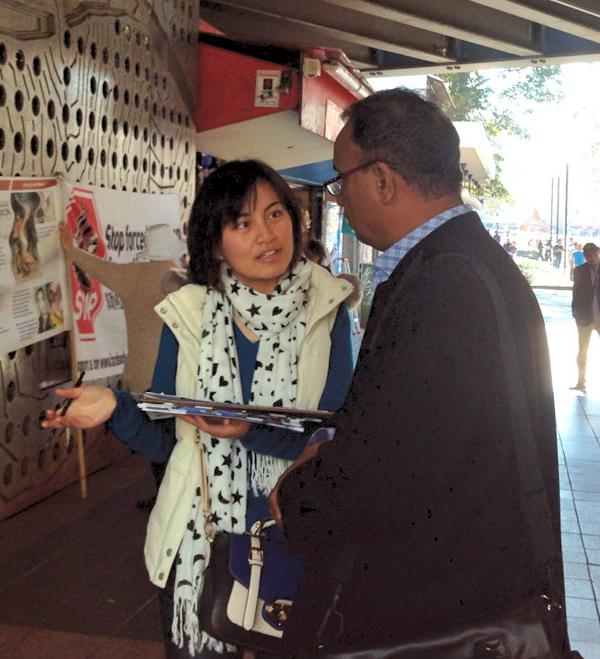 很多过往行人前来签名支持反迫害。有一对年轻的澳洲西人,因为刚刚搬来帕拉马塔市不久,所以连家庭住址都记不住,但还是签了名,并主动要捐钱给这个活动,还有一位香港人也要捐钱帮助。澳洲女士Rui对法轮功学员说:我在遇到法轮功学员之前,所有听到的都是不好的。可是我接触了法轮功学员以后,我喜欢他们,他们是这样的美好、和平。活摘器官是邪恶的。我简直不敢相信这是真的,但这是真的。我儿子就经历了这个器官移植的事情,而且这些器官的来源都是没有登记的。