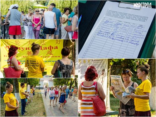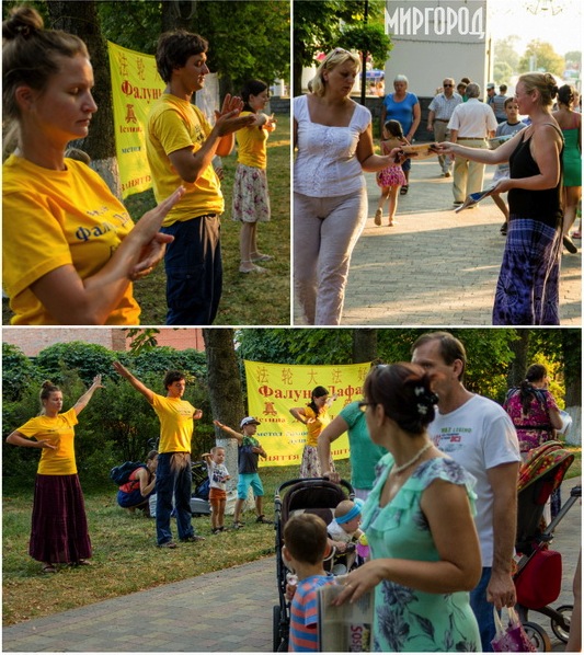 八月九日,部份学员来到乌克兰中部城市波尔塔瓦州的著名度假城,向当地世人介绍法轮功,并在市中心的公园演示功法动作。一个刚从沙滩上来的妇女说:“现在那儿几乎所有的人都在谈论法轮大法,所以我就来了。”