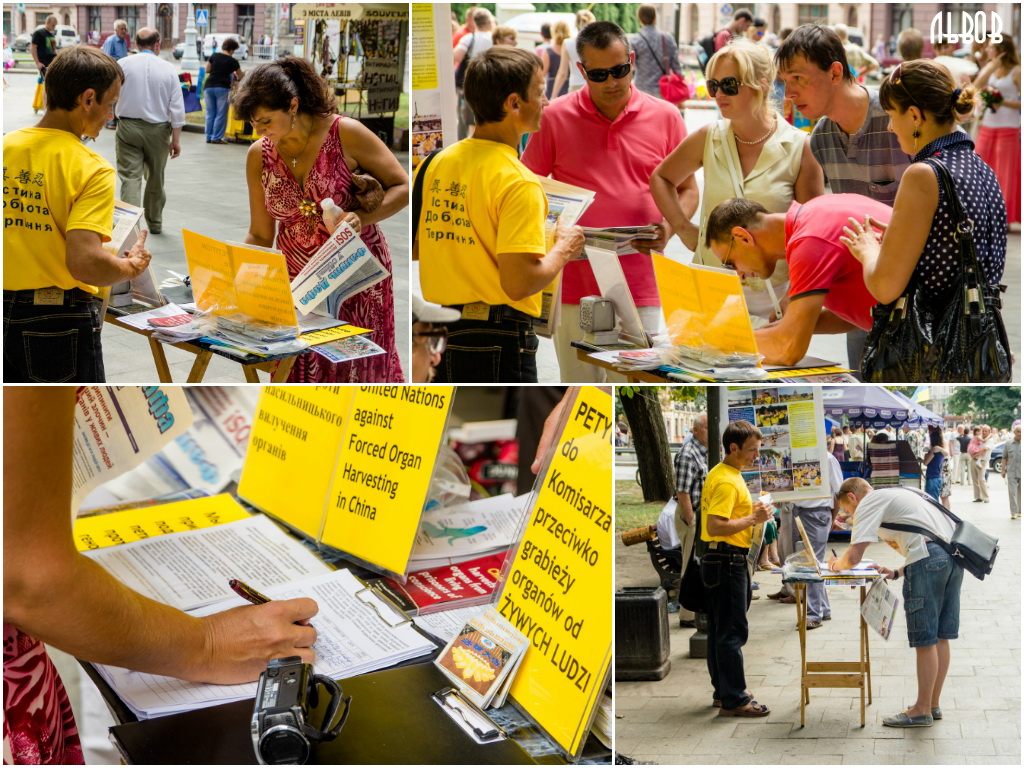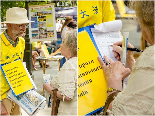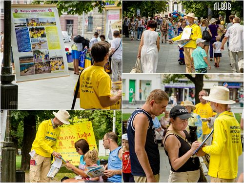 在著名的旅游城市――利沃夫,学员们在市中心演示功法。很多游客在了解真相后,纷纷签名反对中共活摘器官的暴行。有些游客当场购买了,并向大法弟子索要了教功录像光盘。很多游客热情地说:“谢谢你们!好样的!”“谢谢,你们没有忘记我们。”有的说:“你们做着非常重要的事情。”