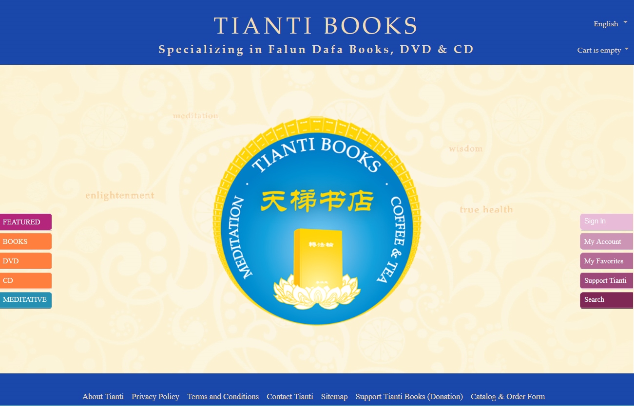 “天梯”的意思是“通天的阶梯”、“上天的阶梯”。天梯书店的新标志,中间突出天梯书店的主打产品,即法轮大法的最主要学习材料《转法轮》,周边有一百多本《转法轮》环绕。每一本《转法轮》上都清晰的写有书名和作者名,强大的能量场给人一种安静美丽的感受。