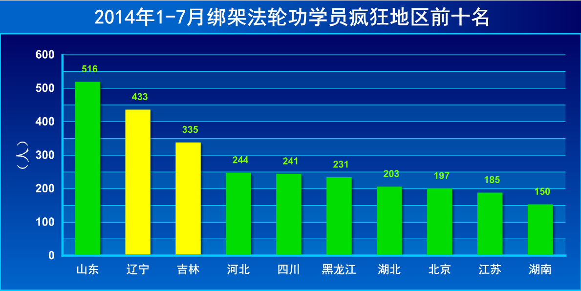 根据明慧网的报道所做的不完全统计,今年头七个月,全国三十个地区有3856位法轮功学员被绑架,辽宁433位法轮功学员被绑架,吉林335位法轮功学员被绑架。辽宁、吉林法轮功学员被绑架人数居全国二、三位。如下面图所示。