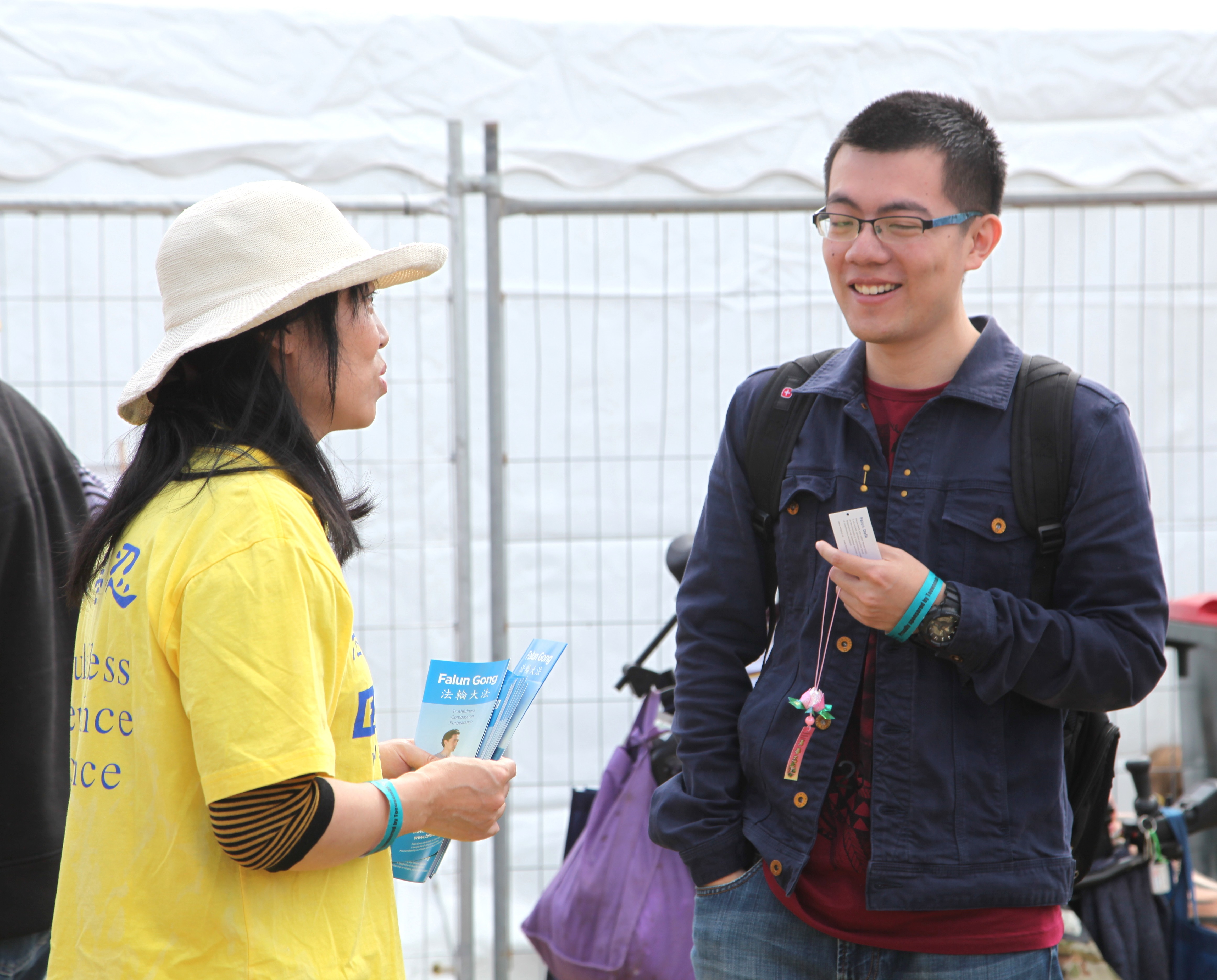 一名来自阿富汗的少女上午来到了法轮功的展位前,一个人静静地观看学员炼功。当学员问她是否愿意学功,女孩立即想学。在炼第一套功法时她表示能感受到能量通过身体。在学习了四套功法后她开心地离去。一个小时后她带了两个朋友回来,他们也对法轮功很感兴趣。一天下来,女孩多次来找学员交谈,她被大法的能量深深吸引着。