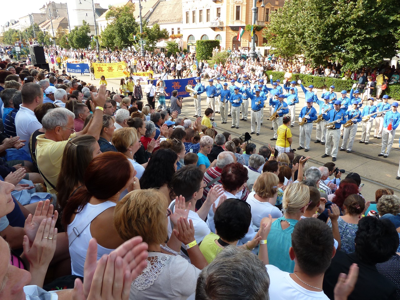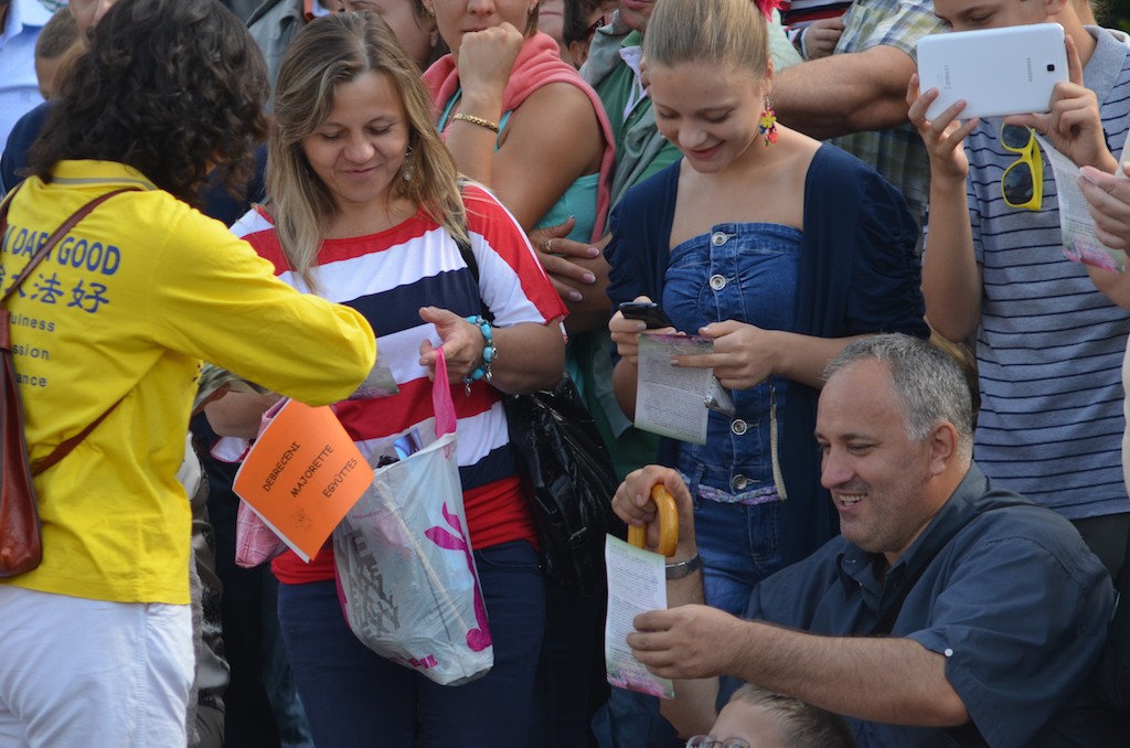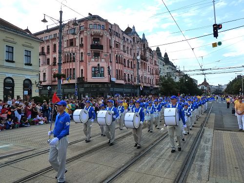 匈牙利是一个淳朴的民族,当他们看到天国乐团的队伍行进到近前时,他们会一直随着演奏乐曲的节拍不停地鼓掌,看到法轮功介绍单上写着的“真善忍”原则,他们很是赞同。