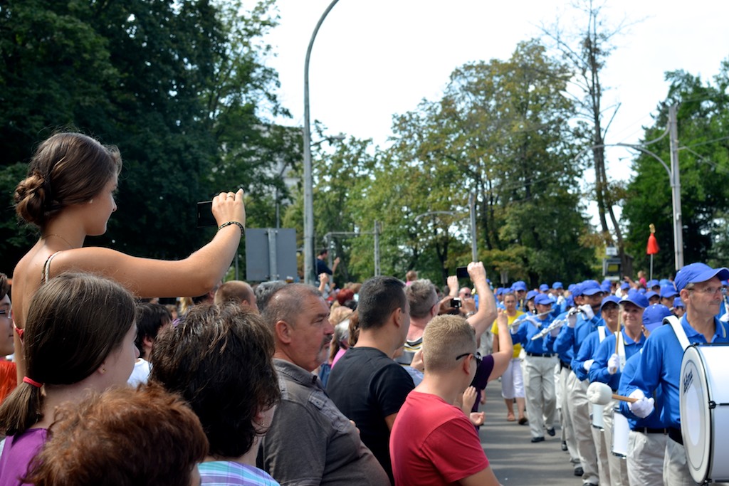 乐团通过第一个观礼台的时候,天空由阴转晴,主持人介绍完真善忍的美好后,愉快地告诉观众“他们(法轮大法欧洲天国乐团)给我们带来了阳光。”