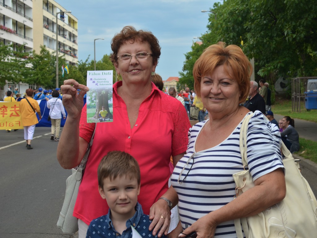 几位住在Monor(靠近布达佩斯)的女士表示,非常喜欢游行阅兵和军乐队,尤其是天国乐团演奏得非常有韵律有节奏。她们非常喜欢真善忍,一位女士拿着法轮功传单说,“越来越多的人应该诚实,善良和宽容。”