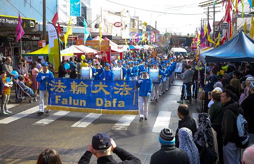 庆典大游行中,雄壮威武的天国乐团演奏了《法轮大法好》、《送宝》等乐曲,所到之处,受到观众们的热烈欢迎。很多人随天国乐团的音乐起舞应和,有的市民兴奋地向游行队伍前排打横幅的学员挥手或鼓掌,并拍摄法轮大法的游行队伍。当法轮大法的游行队伍走过主席台时,主持人介绍说:这是法轮大法-真善忍队伍,法轮大法源自古老的中国传统功法,信仰“真善忍”的理念,可以使修炼者身心健康,已经弘传世界一百多个国家。法轮大法的游行队伍真让人惊叹……