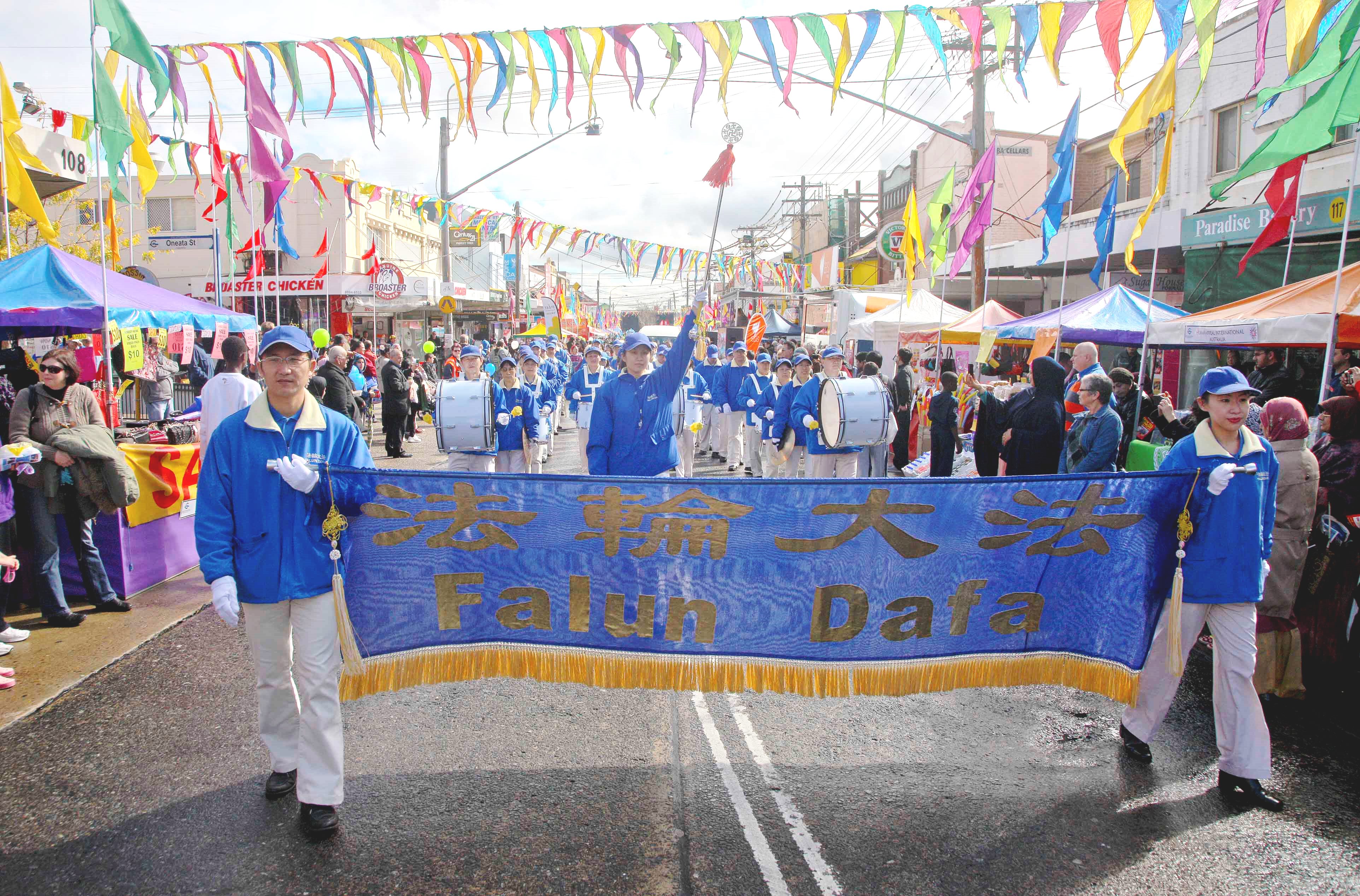 法轮功学员不仅把真、善、忍的纯正能量传播给这个地区的民众,而且净化着所到之处的天空。原本还下着大雨的天气很快放晴。一片蓝天象开天窗一样出现在Lakemba市的上空,阳光从云间透出,直射小城。正如一位天国乐团成员的感慨:“大法音乐演奏到哪里,哪里必晴天。”