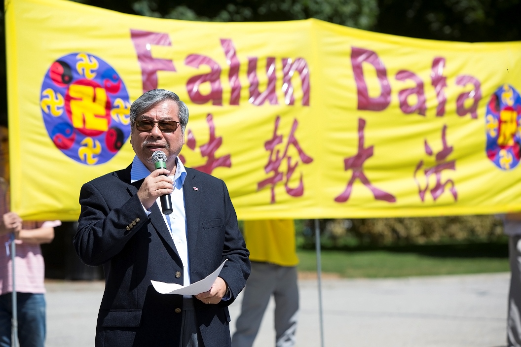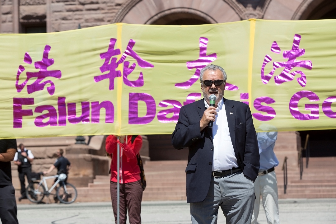 加拿大前联邦参议员迪尼诺(Con Di Nino)一直支持法轮功的反迫害行动,退休后还继续支持。他在发言中说,加拿大公民及移民部长亚历山大(Chris Alexander)本来要来参加活动,但未能成行。他表示了支持法轮大法所提倡的原则,“我带来了他的问候和祝愿”。