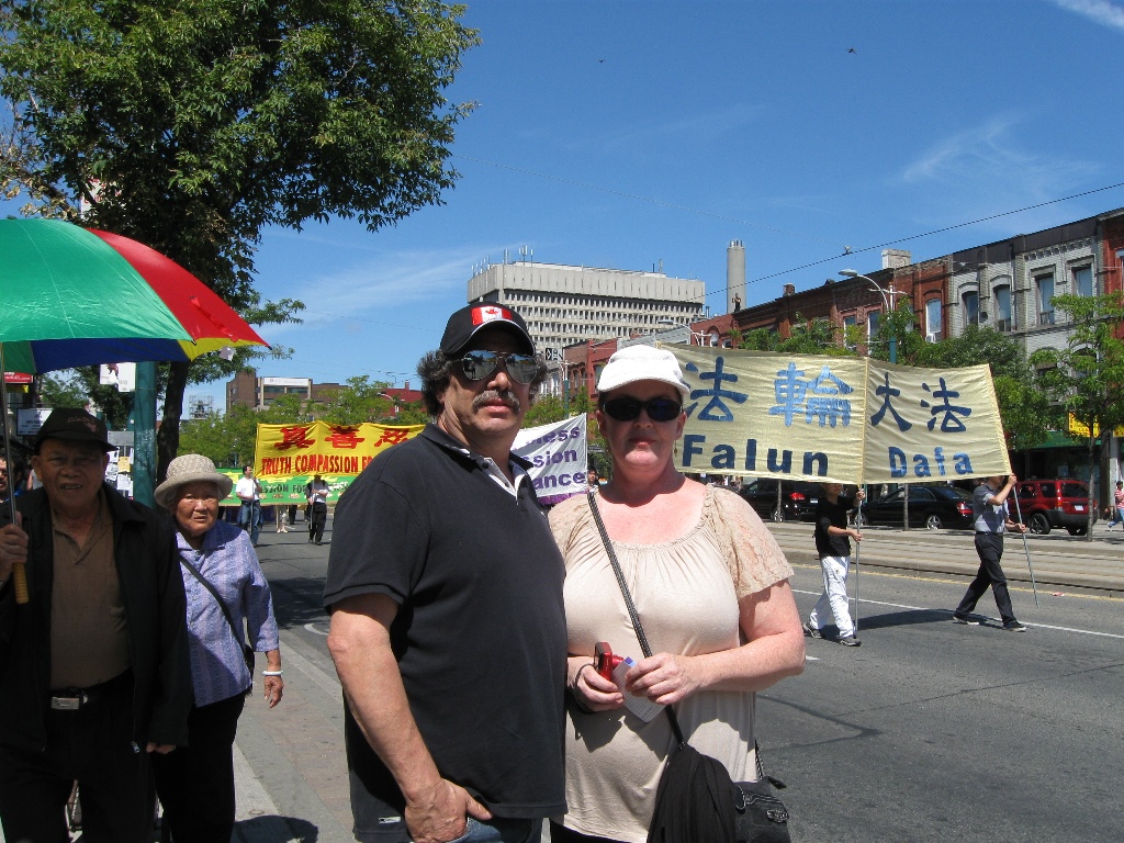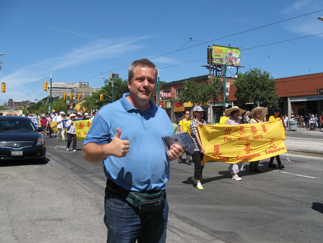 来自多伦多的西人观众Jason一直跟着游行队伍,他表示游行很感人。他是通过他的朋友知道法轮功的。他说:“我知道他们是非常平和的一群人,他们只是想有一个自由炼功环境,不幸的是他们在中国是受到很残酷的迫害。我非常支持他们反迫害。”