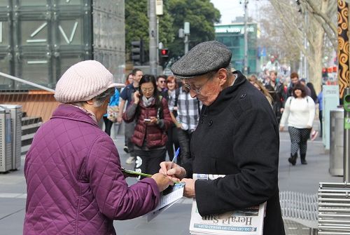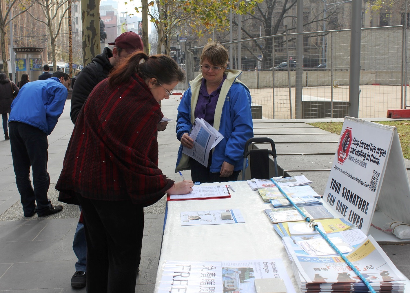 来自香港的留学生小黄(Chuff Wong)在墨尔本大学就读,在呼吁制止迫害法轮功的征签表上签名之后,和学员交谈了很久,因为一开始很怀疑“活摘器官”指控的真实性,所以问了很多问题,学员一一做了回答,最后他沉痛的说:“必须立即制止这一切。”