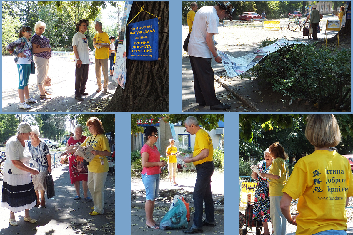 在乌克兰政府军收复不久的斯拉扬斯克,这一区的法轮功学员也在八月二十四日的独立日,举行弘法讲真相活动。由于这一带居民,不久前经历了断水断电断瓦斯、食物短缺的艰难时期,很多居民至今也没有完全从恐惧中恢复过来。当他们看到法轮功学员演示的功法,以及法轮功学员派发的真相报纸后,表示今天我们的世界非常需要“真善忍”。有的市民说:“希望法轮功学员经常来,法轮功学员的活动对治愈市民的心理创伤很有帮助。”