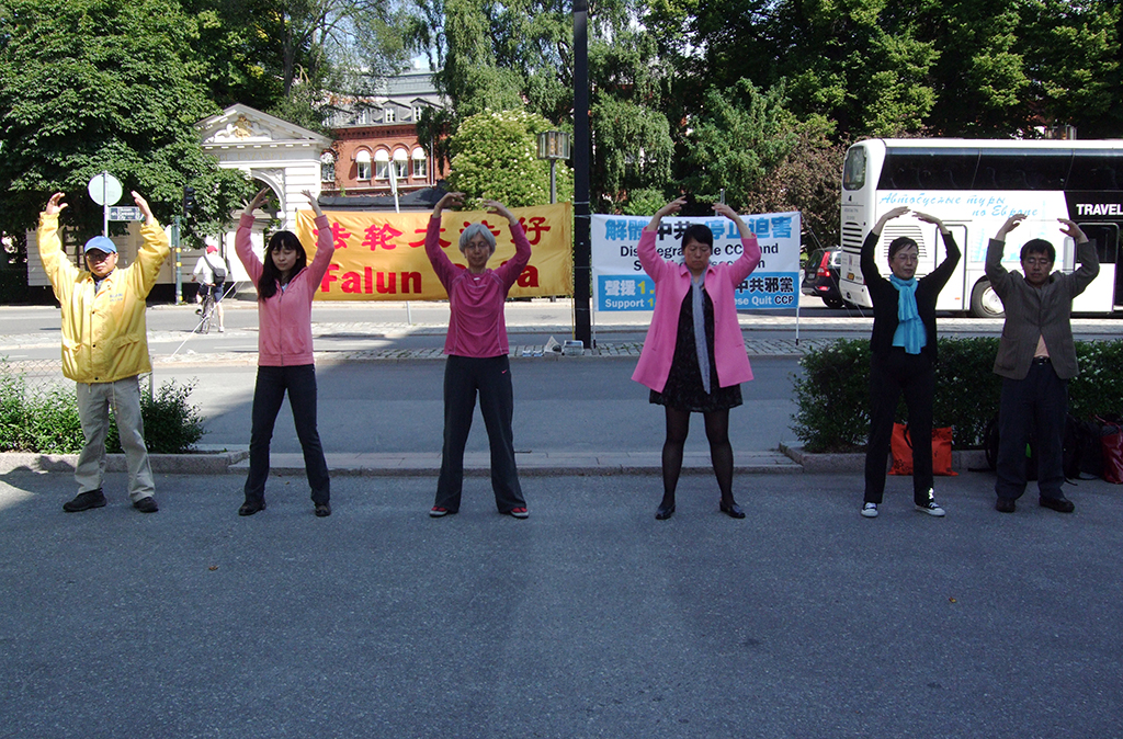 瑞典退!党!服务中心的义工们自今年六月份以来,每个周末都在斯德哥尔摩市政厅前举办洪法、讲真相劝“三:退.”活动,让这个著名的旅游景点又出现了一道风景,那就是伴随着法轮功悦耳的炼功音乐的祥和的炼功场面。 法轮功学员在这里向前来旅游的中国人发放真相资料,向人们讲述法轮大法的美好以及中共编造谎言欺骗民众、残酷迫害法轮功的事实真相。帮助那些明白真相的人们退出中共邪*党-组织——共产党、共青团和少先队(简称“三:退.”)。