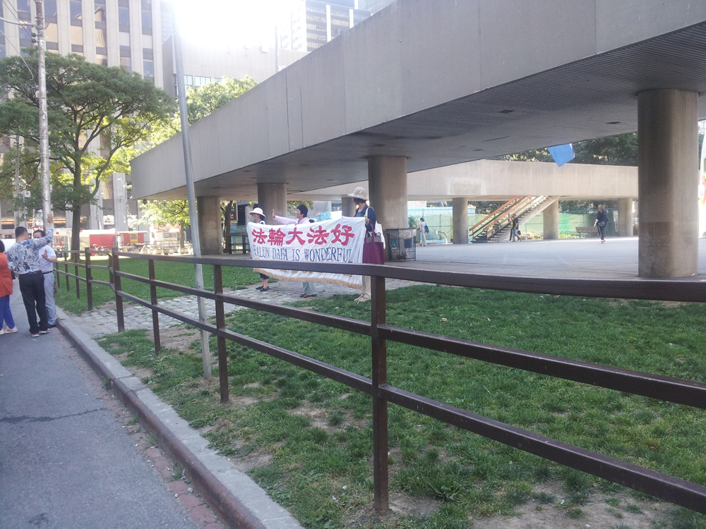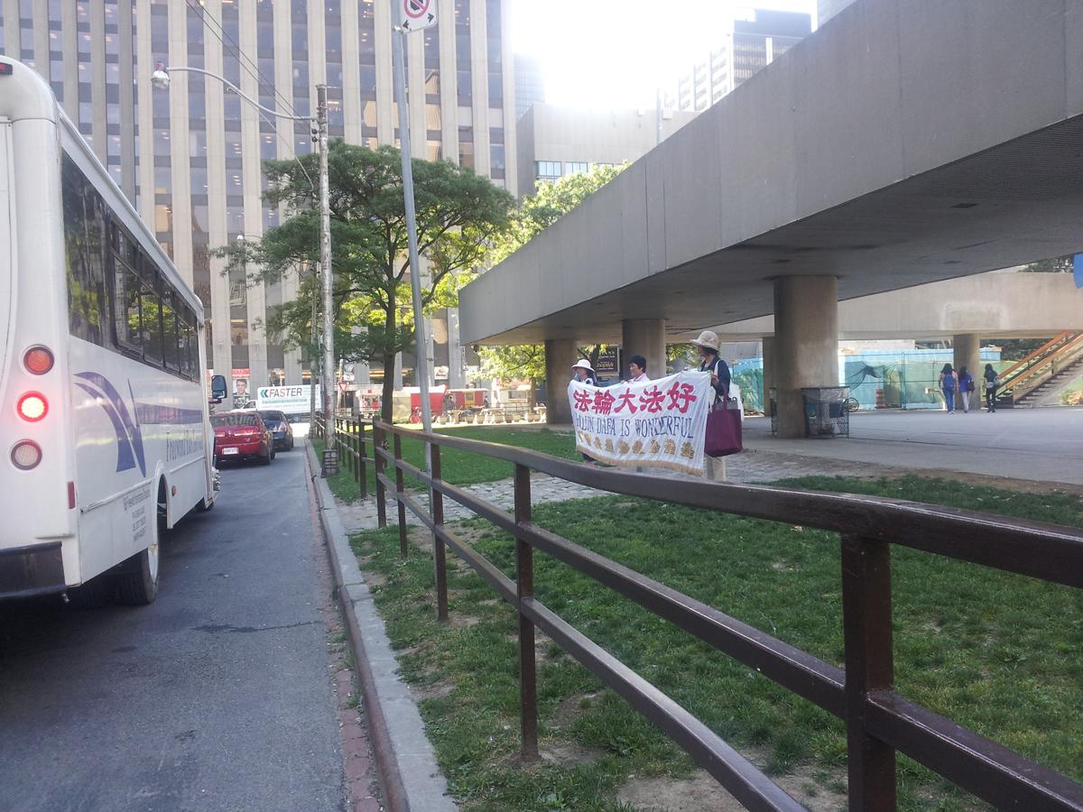 从洛杉矶法会回来之后,同修们希望更好的参与到景点讲真相中来。去年10月底的一天,三位同修不约而同的来到多伦多市政府广场前,在短短的二个小时里我们迎来了三辆中巴的大陆游客,当时印象深刻,有来自福建的,北京的,还有湖南的大陆同胞。我们三人面对几十位大陆同胞,跑前跑后的讲。当大陆游客走后,这两位同修说,以后我们每个星期日从多伦多北边来一车学员到市政府景点。我当时心里想,那真是太好了。第二天是星期三,从北边开车来了5位同修,她们说已经决定,每周一到周五都会从北边来一车学员,大家都非常高兴。