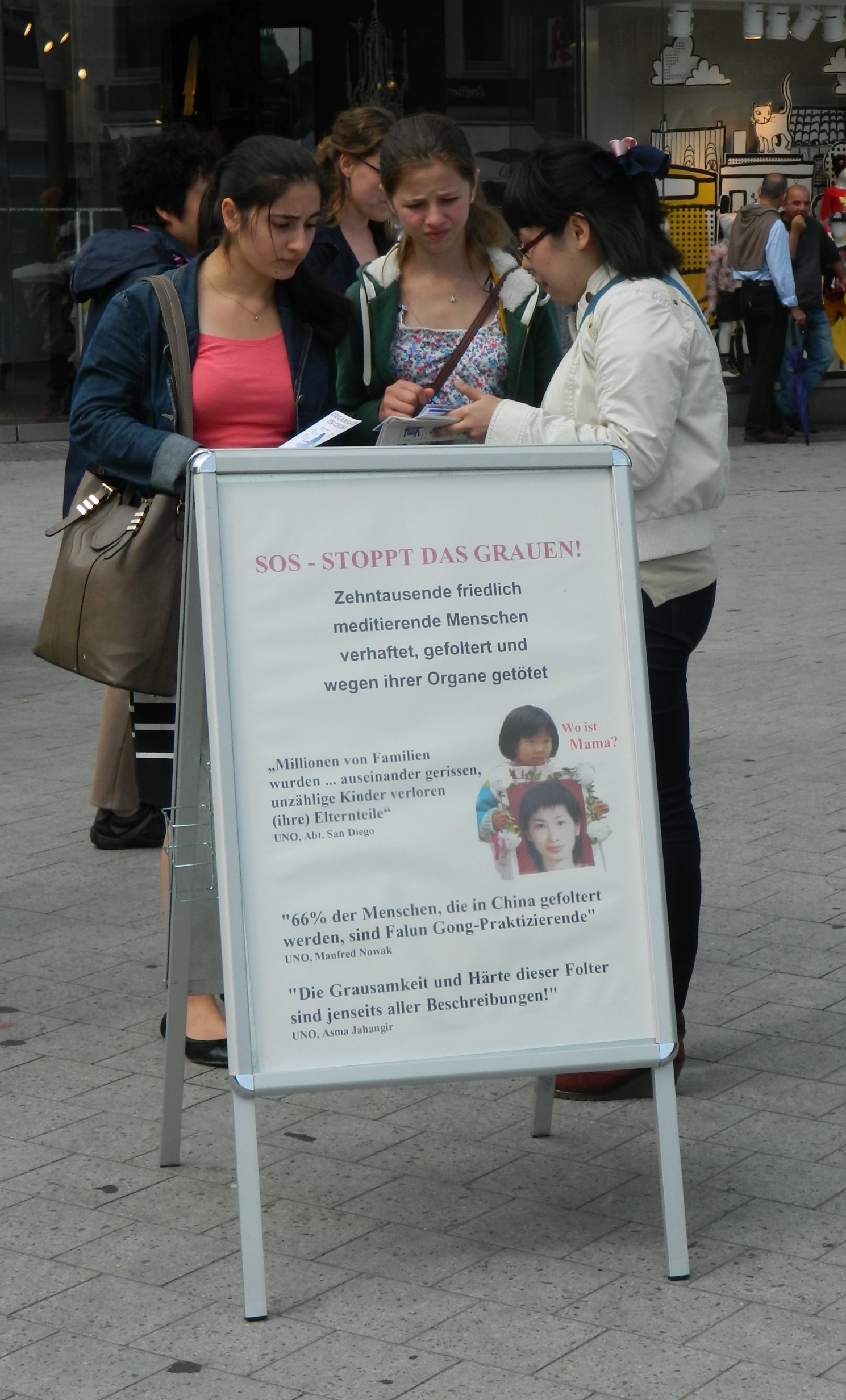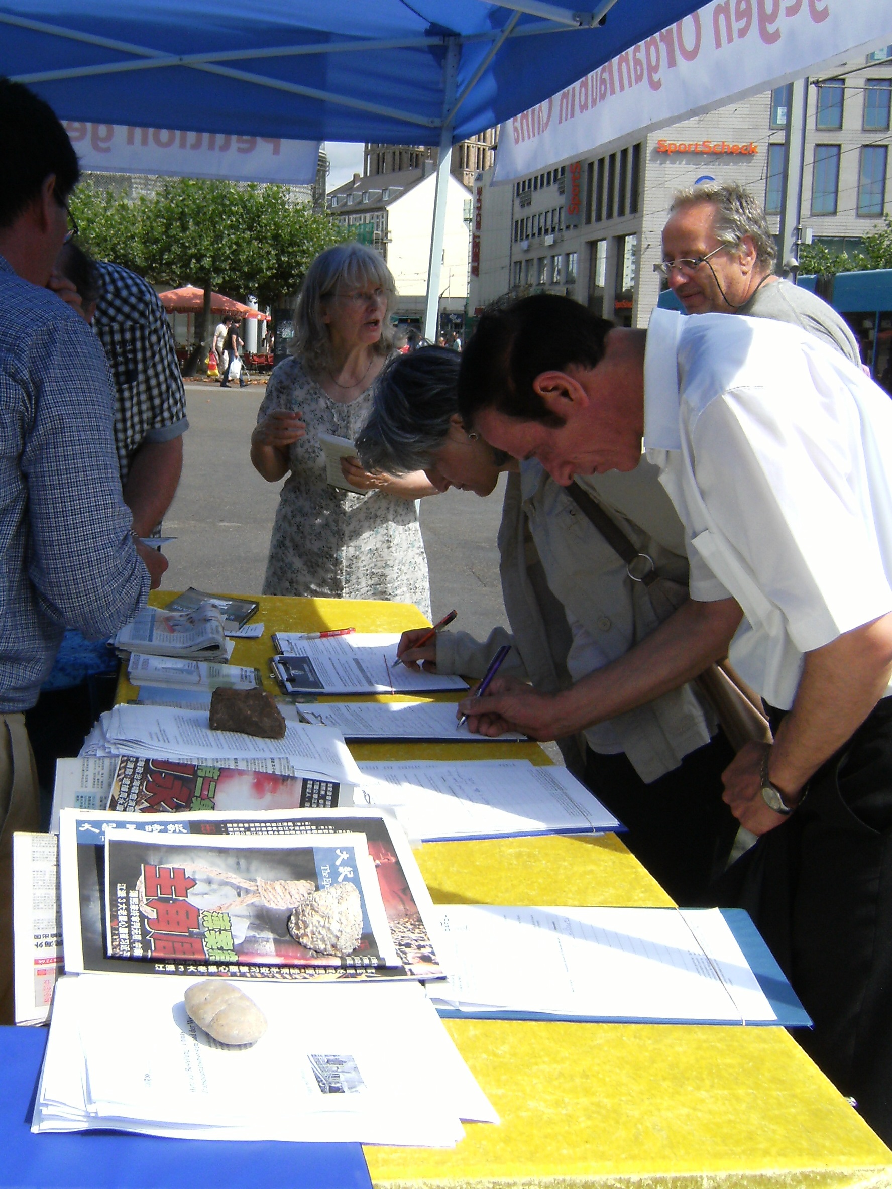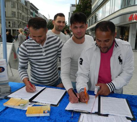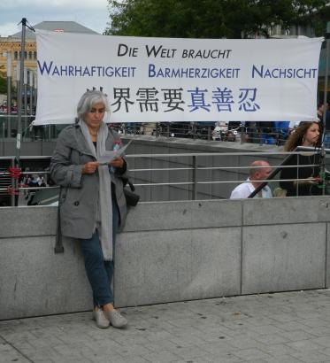 一位德国女士走近展位时向学员们说,她简直不敢相信(这些暴行)。在知悉了迫害的背景和事实之后,她乐意的在征签表上签了名。过了一会儿,她又带着三个朋友回来,想要参与反迫害联署。 另一名年轻女子也是同样情况,在自己已经签署了请愿书之后,还带了她的朋友来签。