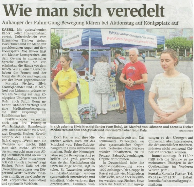 一位黑森——下萨克森在线报(Online-Zeitung HNA.DE)的记者特意前来了解真相。之后,他把对这次对法轮大法的印象撰稿成文,以“修身养性之道--记法轮大法在国王广场上的信息日”为题目,并附上一张大法弟子在此次活动中讲真相和演示五套功法的照片,于当日即发表在互联网上。