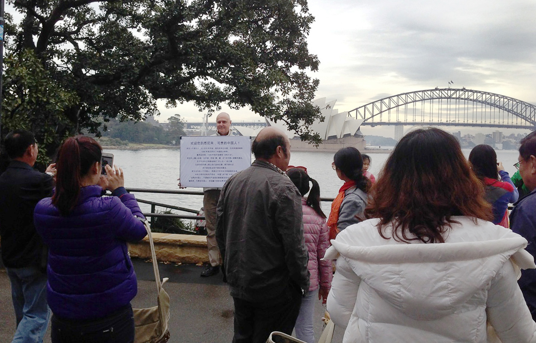 映入他们眼帘的首先是这位先生手举的展板:欢迎您到悉尼来,可贵的中国人!
