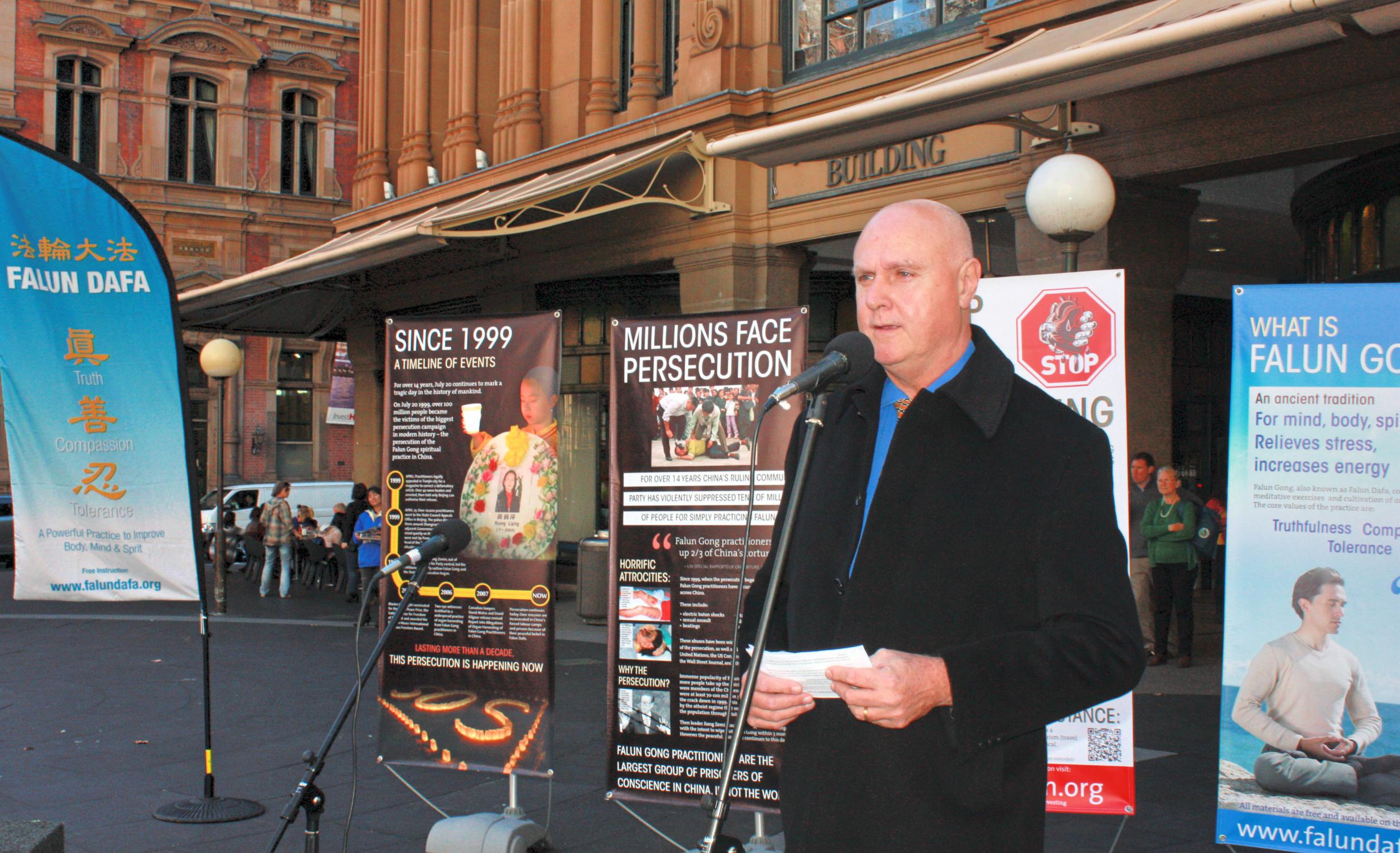 ![]() 澳洲法轮功学员约翰•戴勒(John Deller)手举他制作的真相展板 |