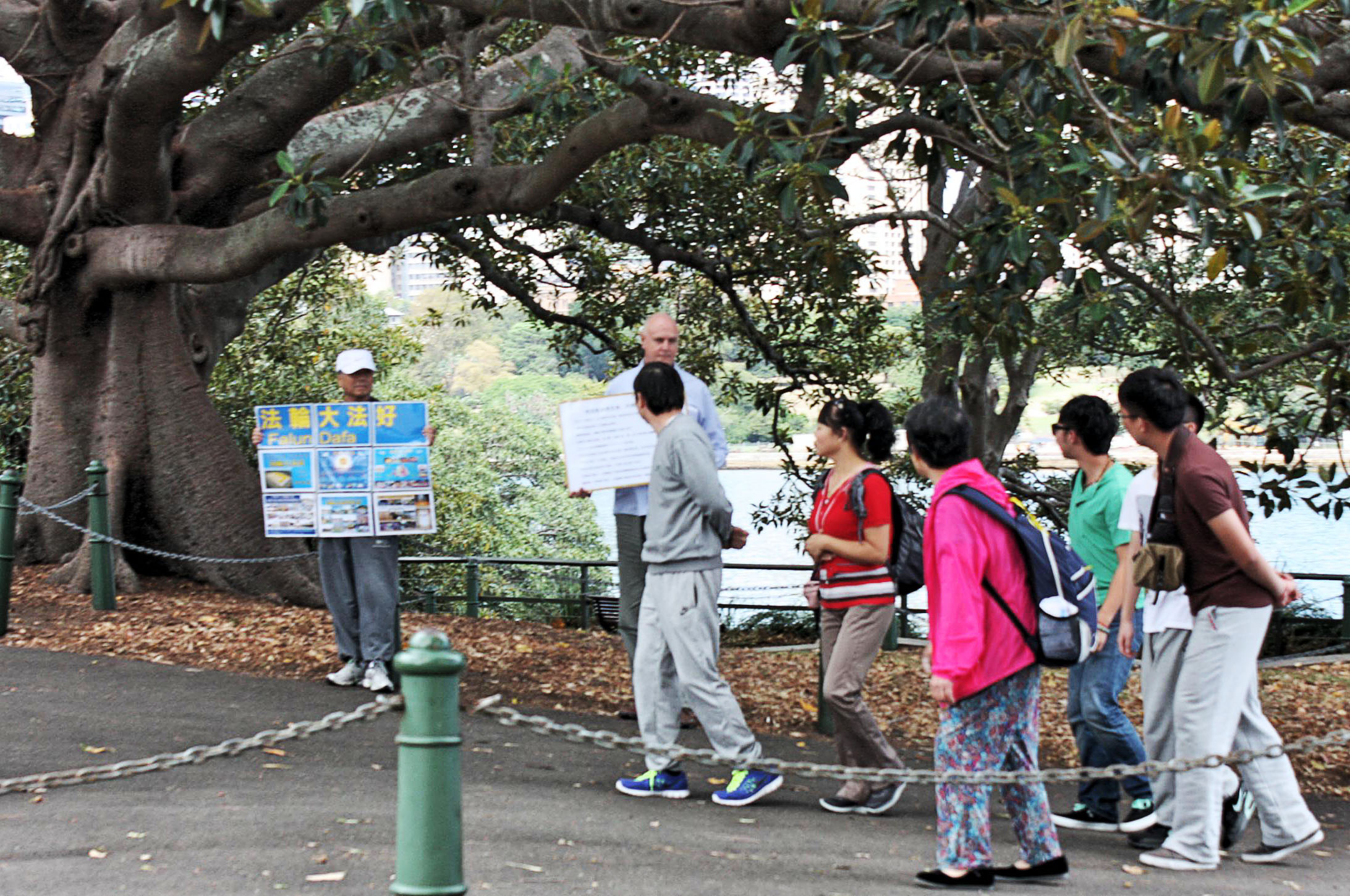 走近再细看,华人游客们又惊呼:原来澳洲人也炼法轮功啊!他是为我们而来!