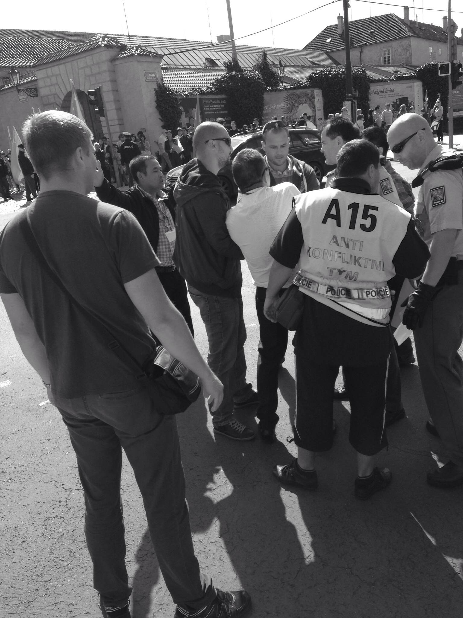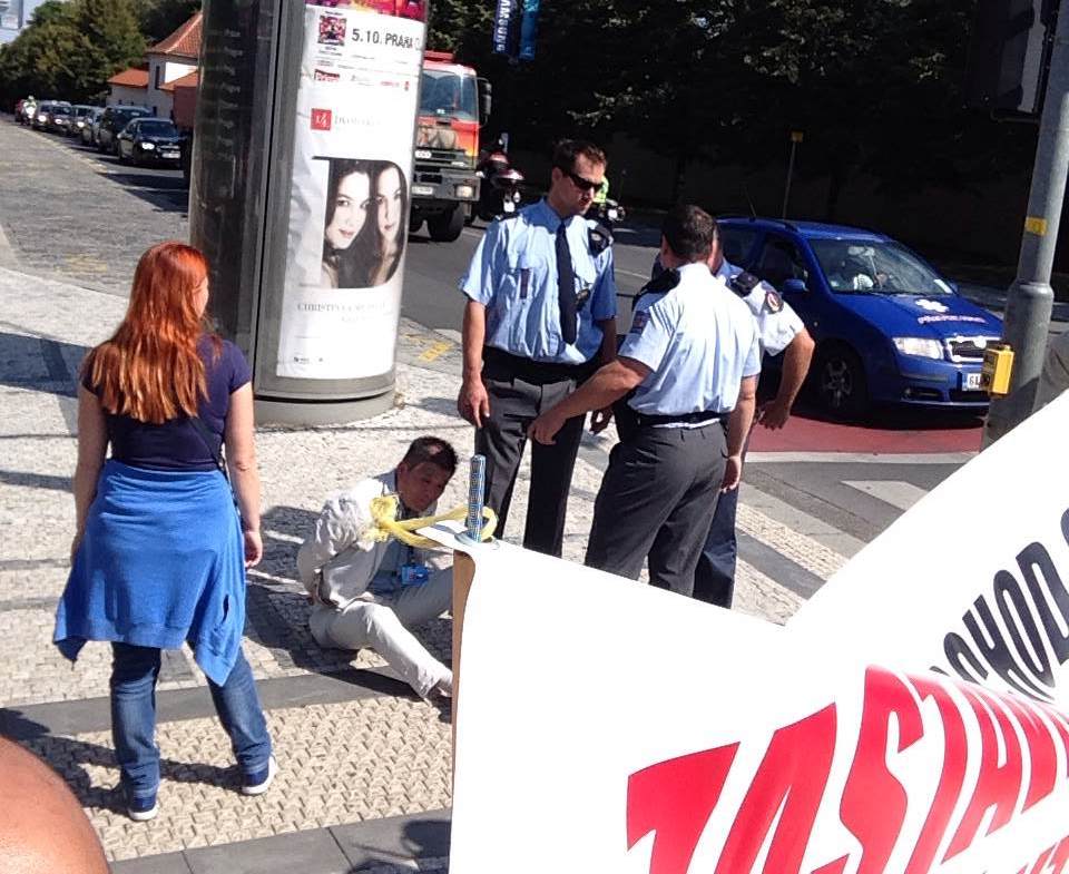 八月二十八日下午,布拉格城堡后门的人行道上站满中共所谓“欢迎团”,以迎接即将到来的代表团车队。他们还派出人手“包夹”拿抗议横幅的法轮功学员。警察根据以往经验,要求“欢迎团”站在另一侧人行道上,以保护法轮功学员的权益,但是遭到在场的一个脖子上挂着中使馆身份牌的官员的强力阻止。不得已,警察让步,法轮功学员只能站在远离中共“欢迎团”的路口举着横幅。但“欢迎团”的暴徒和那个中共官员仍得寸进尺,如影随形地跟过来,不听警察劝阻。