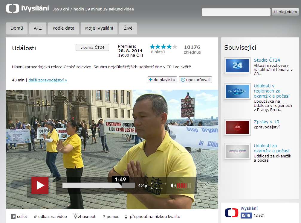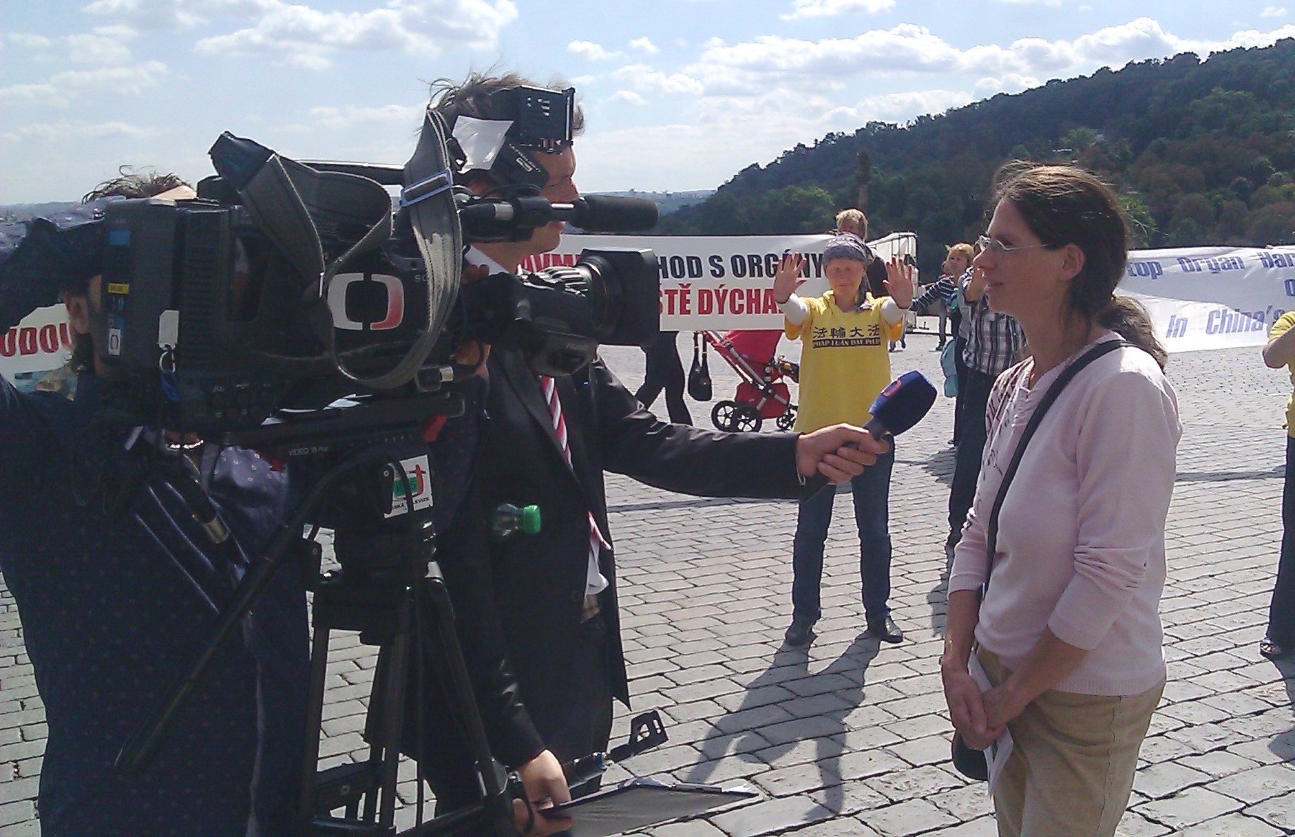 ![]() 图13:捷克电视台报道法轮功对张高丽等迫害罪行的抗议活动 |